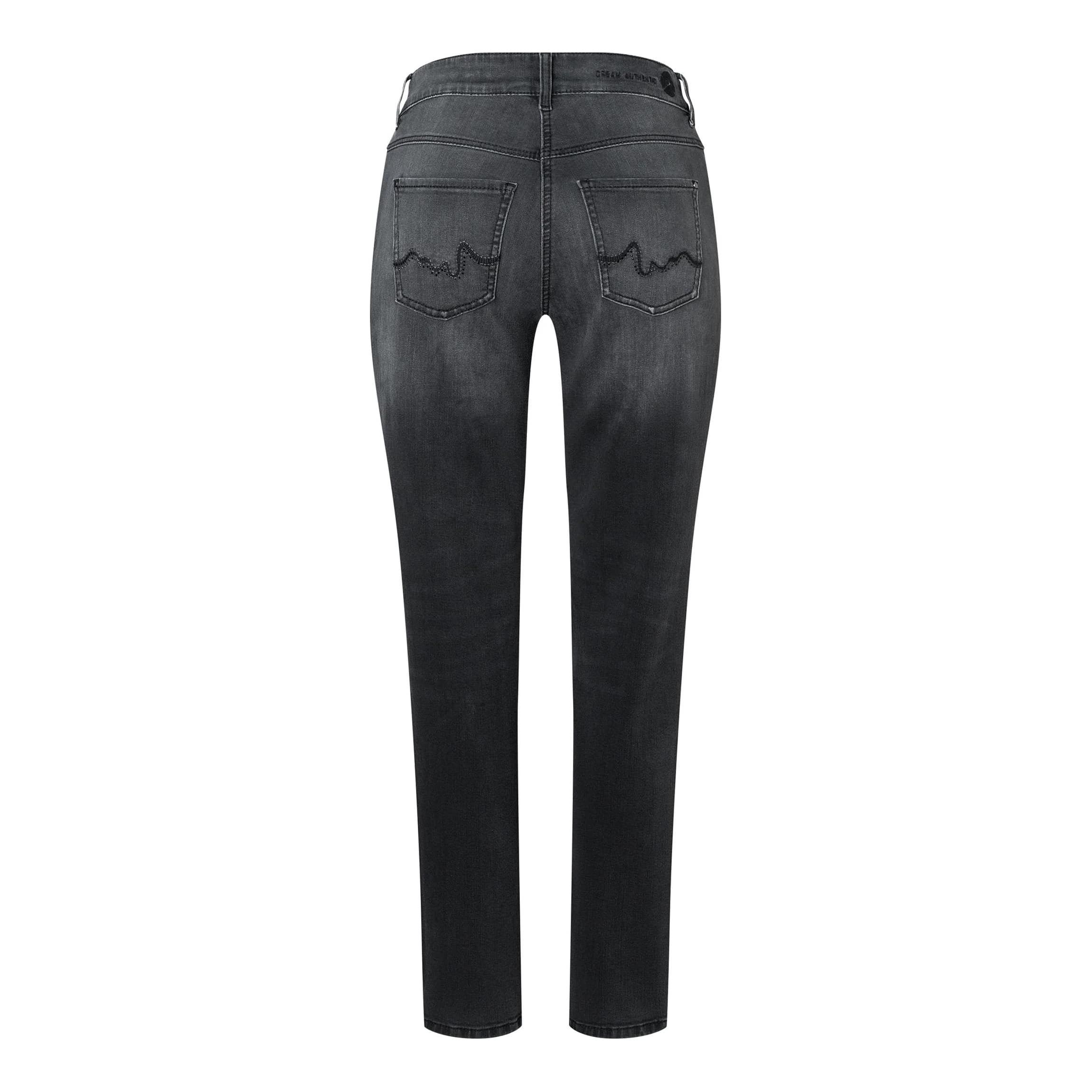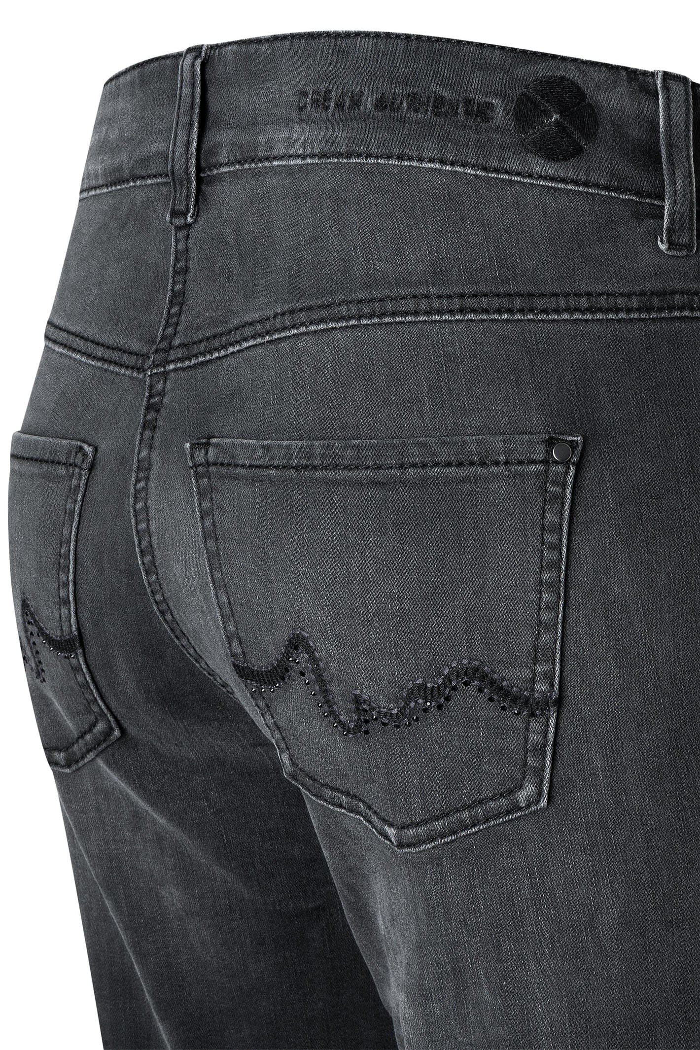 Straight fit jeans van MAC, model Dream auth. edgy glam in modern black wash. Deze grijze spijkerbroek is gemaakt van stretch denim, heeft een normale taille en rechte broekspijpen. De jeans sluit met een knoop- en ritssluiting en heeft twee steekzakken en twee achterzakken die versiert zijn met strass steentjes.