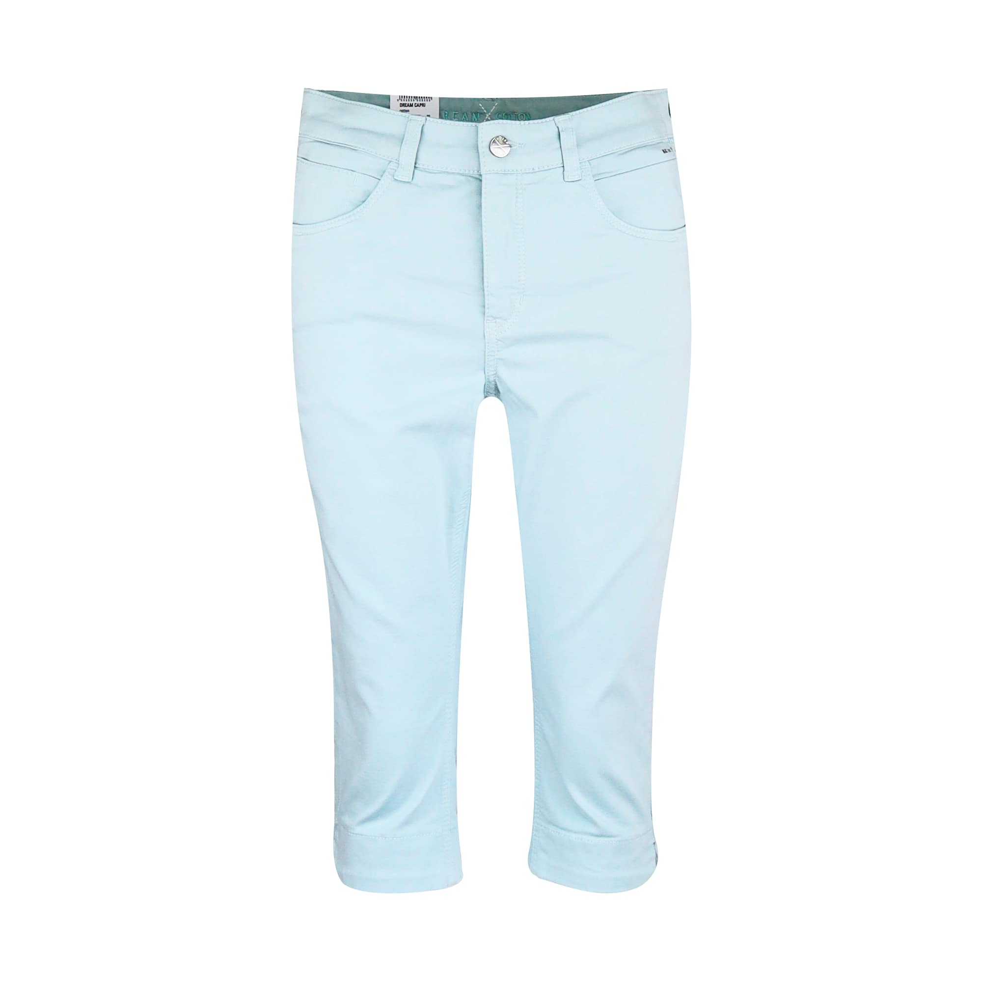 Lichtblauwe capri broek van MAC, model Dream Capri cotton. Deze katoenen broek valt net onder de knie en heeft kleine splitjes aan de zijkant. De broek sluit met een knoop- en ritssluiting, heeft twee steekzakken achter ritsjes aan de voorzijde en twee achterzakken.