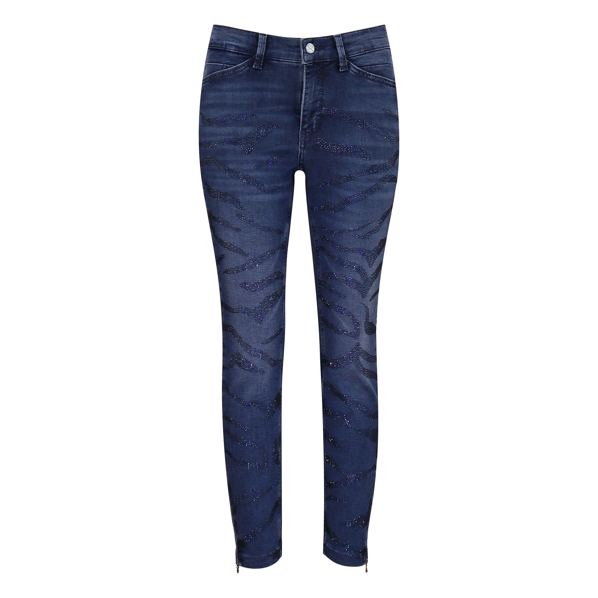 Slim leg jeans van MAC Jeans, model Dream Chic glam pure. Deze blauwe broek is gemaakt van stretch denim met aan de voorzijde blauwe steentjes en heeft een normale taille met toelopende broekspijpen. De jeans sluit met een knoop- en ritssluiting en heeft twee steekzakken en twee achterzakken. Aan de onderkant van de broekspijpen zitten twee ritsjes.