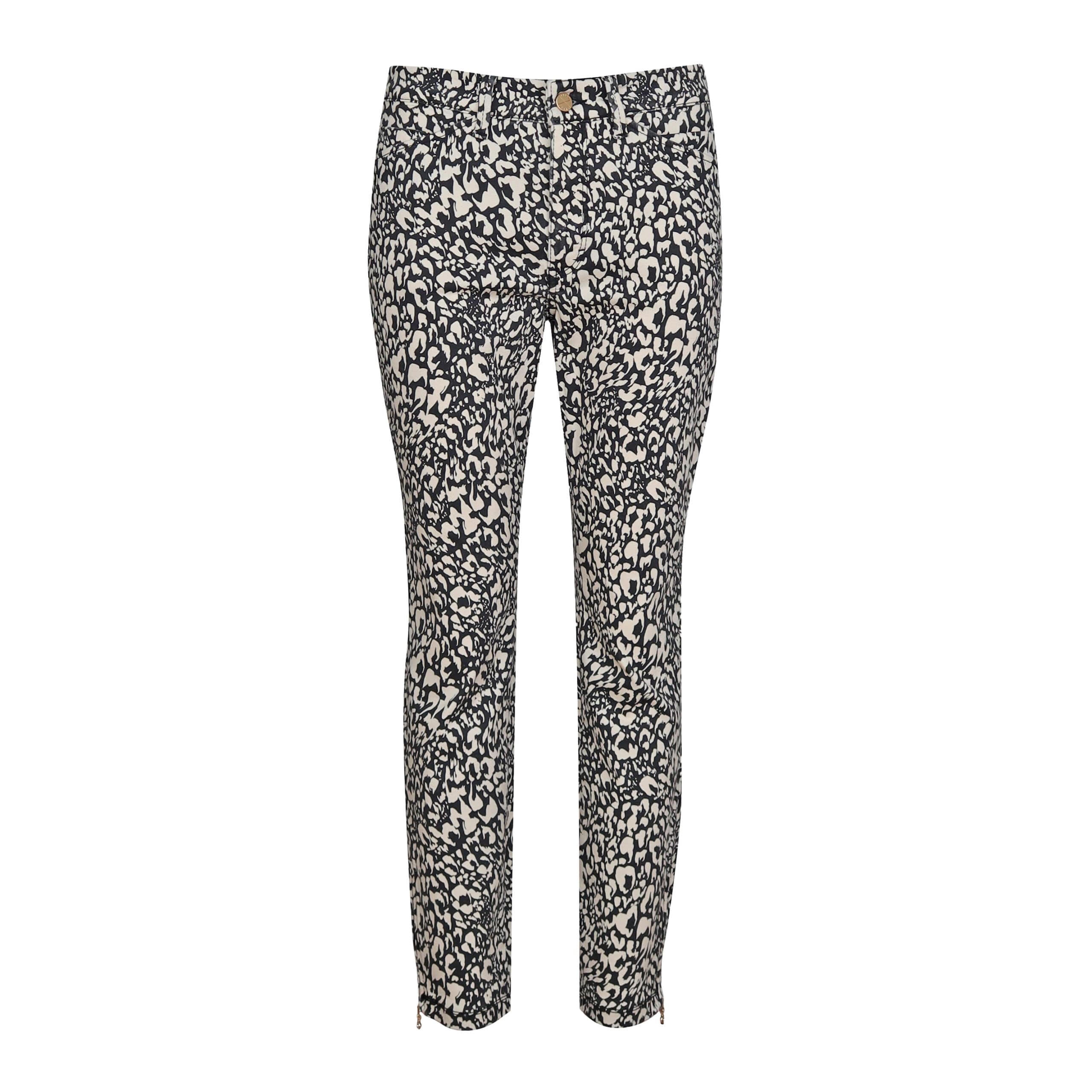 Slim leg jeans van MAC Jeans, model Dream Chic, slim leg. Deze broek is gemaakt van stretch denim met een zwart en ecru motief en heeft een normale taille met toelopende broekspijpen. De jeans sluit met een knoop- en ritssluiting en heeft twee steekzakken en twee achterzakken. Aan de onderkant van de broekspijpen zitten twee ritsjes.