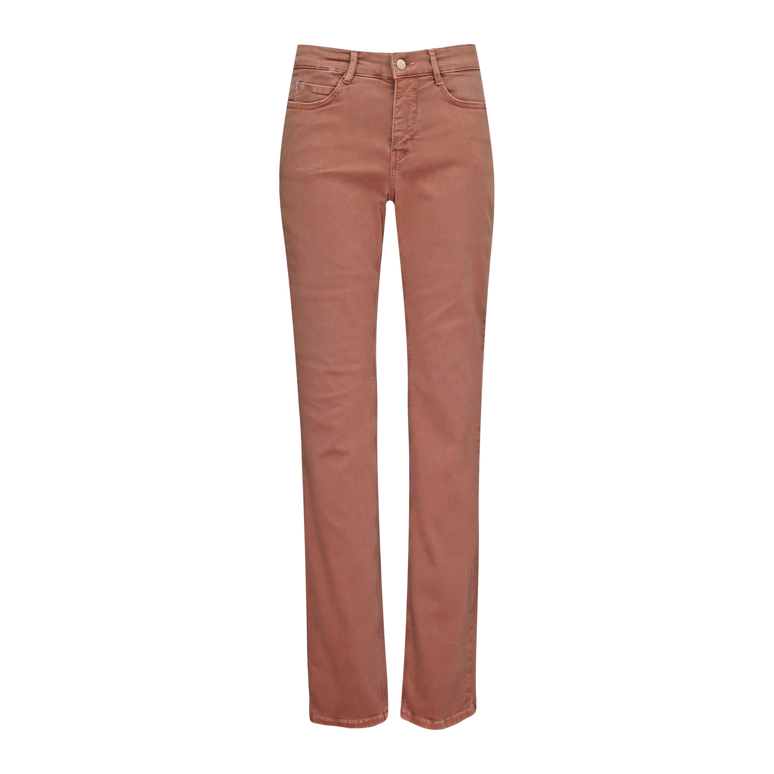 Bruine jeans van MAC, model Dream, straight leg. Deze broek is gemaakt van een bruine denim stretch stof. De jeans sluit met een knoop- en ritssluiting, heeft twee steekzakken, twee achterzakken, normale taille en een rechte pasvorm.