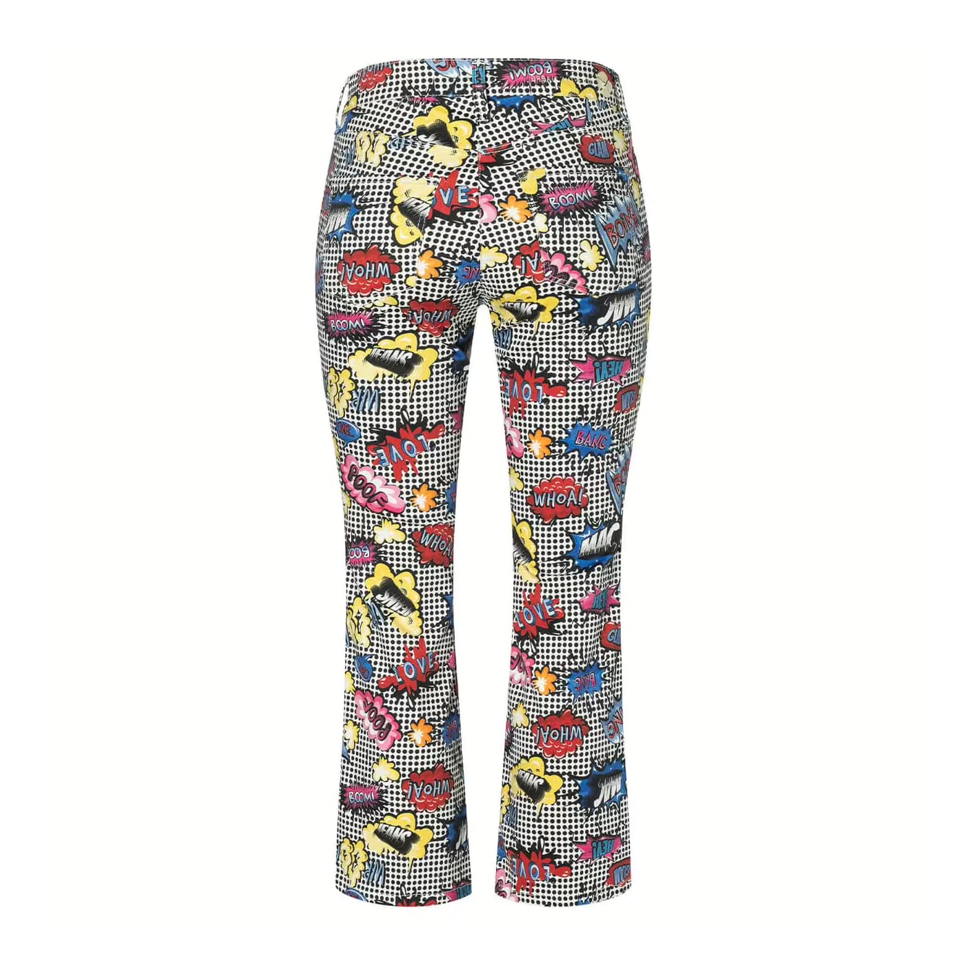 Jeans met een stripprint van MAC, model Dream Kick authentic in comic smash. Deze 7/8 denim broek heeft een normale taille, twee steekzakken aan de voorzijde, twee achterzakken en sluit met een knoop- en ritssluiting. De jeans is gemaakt van een denim stretch stof met een witte basis met daarop zwarte stippen en een stripprint en heeft flared broekspijpen.