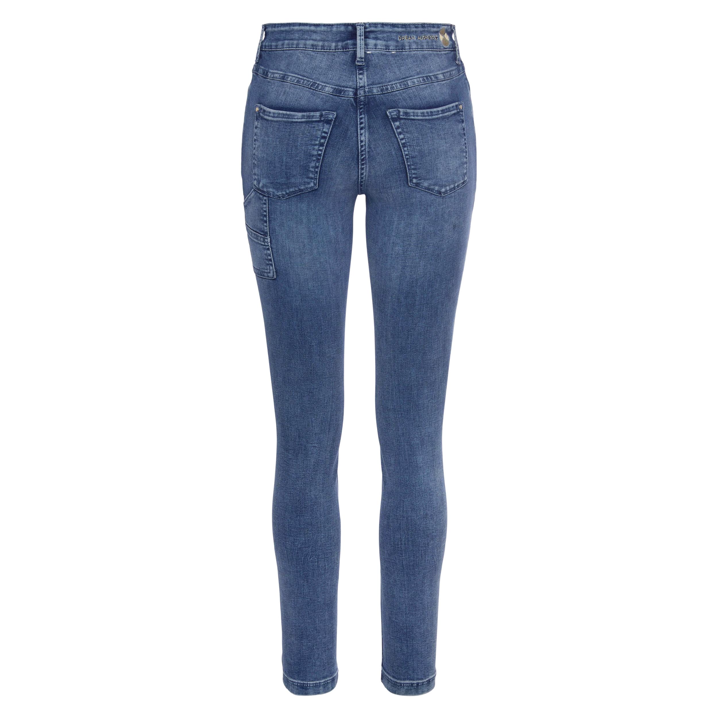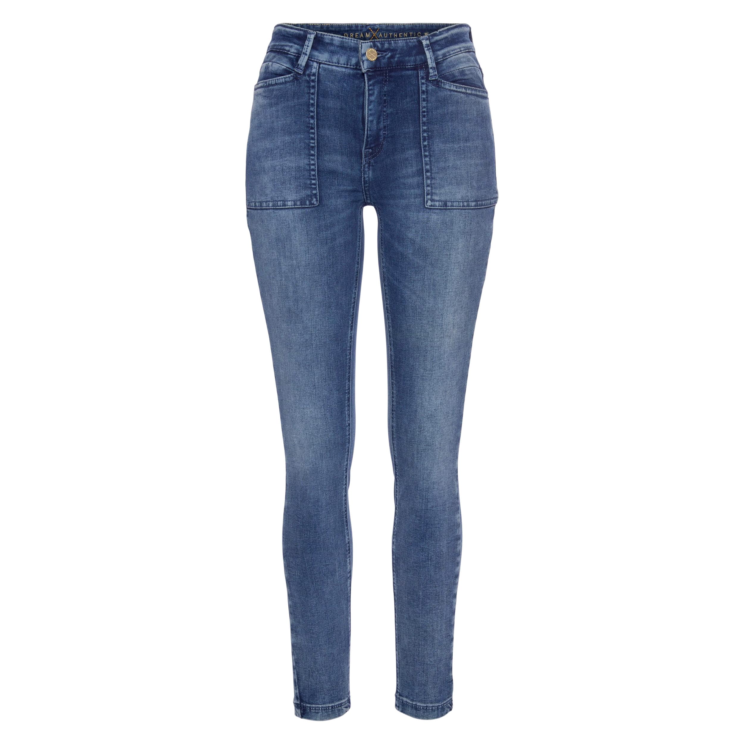 Blauwe jeans van MAC, model Dream Skinny Worker authentic. Deze skinny denim broek heeft een hogere taille, twee worker steekzakken aan de voorzijde, twee achterzakken en sluit met een knoop- en ritssluiting. De jeans is gemaakt van een denim stretch stof en heeft een klein zijzakje.
