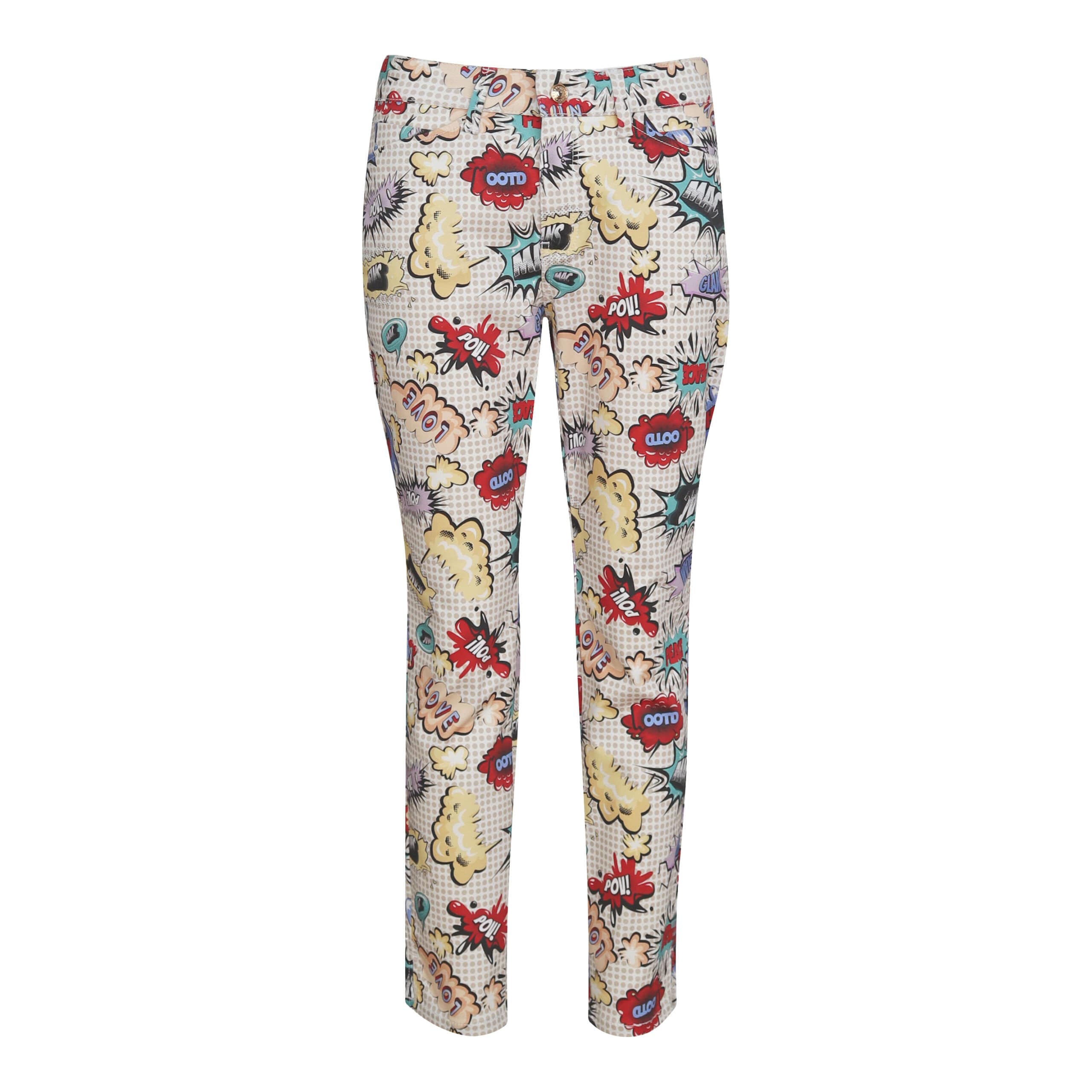 Cropped jeans van MAC, model Dream Summer, slim leg in comic smash. Deze 7/8 broek is gemaakt van een katoenen stretch stof (wonderlight) met een witte basis met daarop beige stippen en een stripprint, heeft een normale taille en kleine splitjes aan het einde van de broekspijpen. De pantalon sluit met een knoop- en ritssluiting, heeft twee steekzakken, twee achterzakken en een slim fit pasvorm.