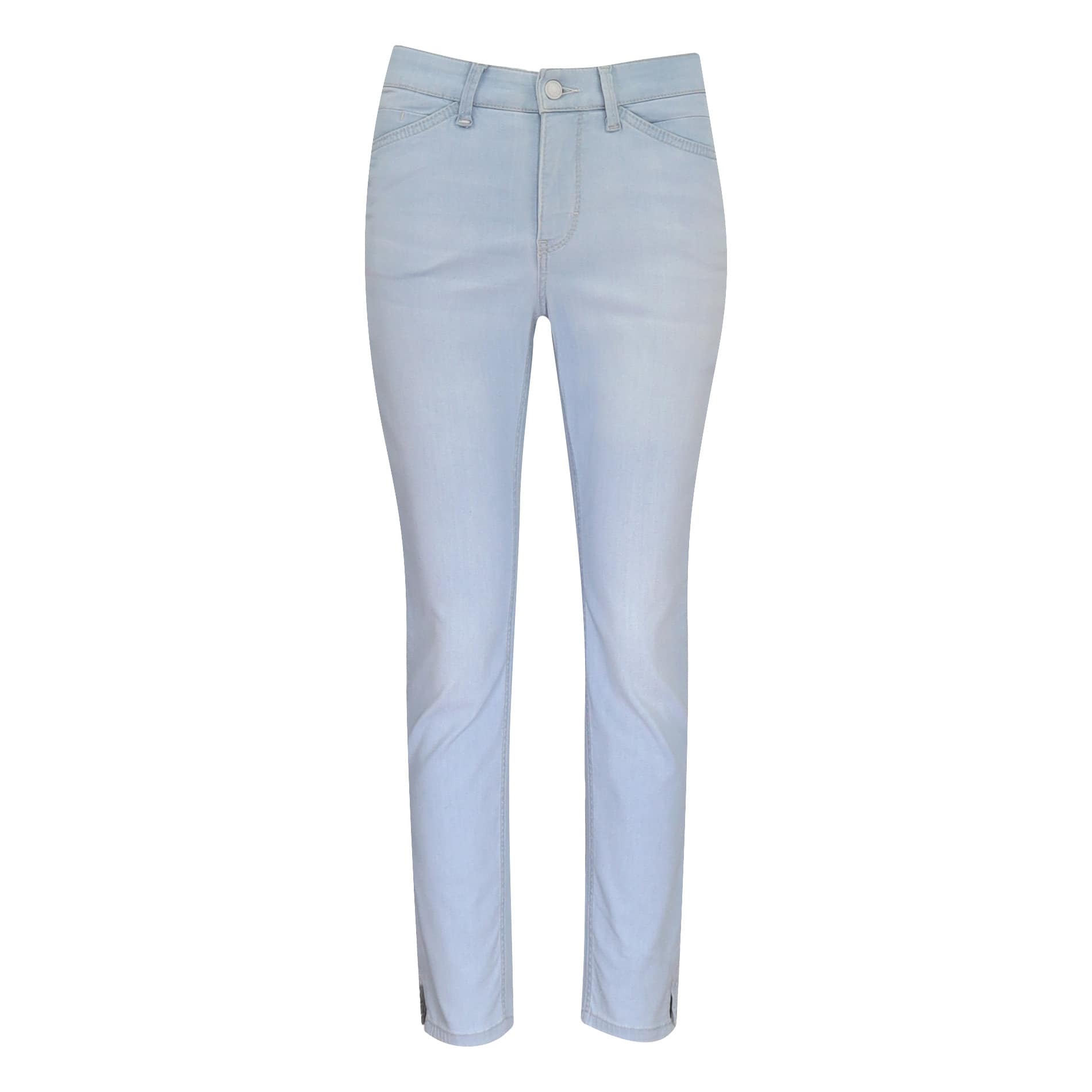 Cropped jeans van MAC, model Dream Summer, slim leg. Deze 7/8 broek is gemaakt van een katoenen stretch stof (wonderlight), heeft een normale taille en kleine splitjes aan het einde van de broekspijpen. De pantalon sluit met een knoop- en ritssluiting, heeft twee steekzakken en twee achterzakken.