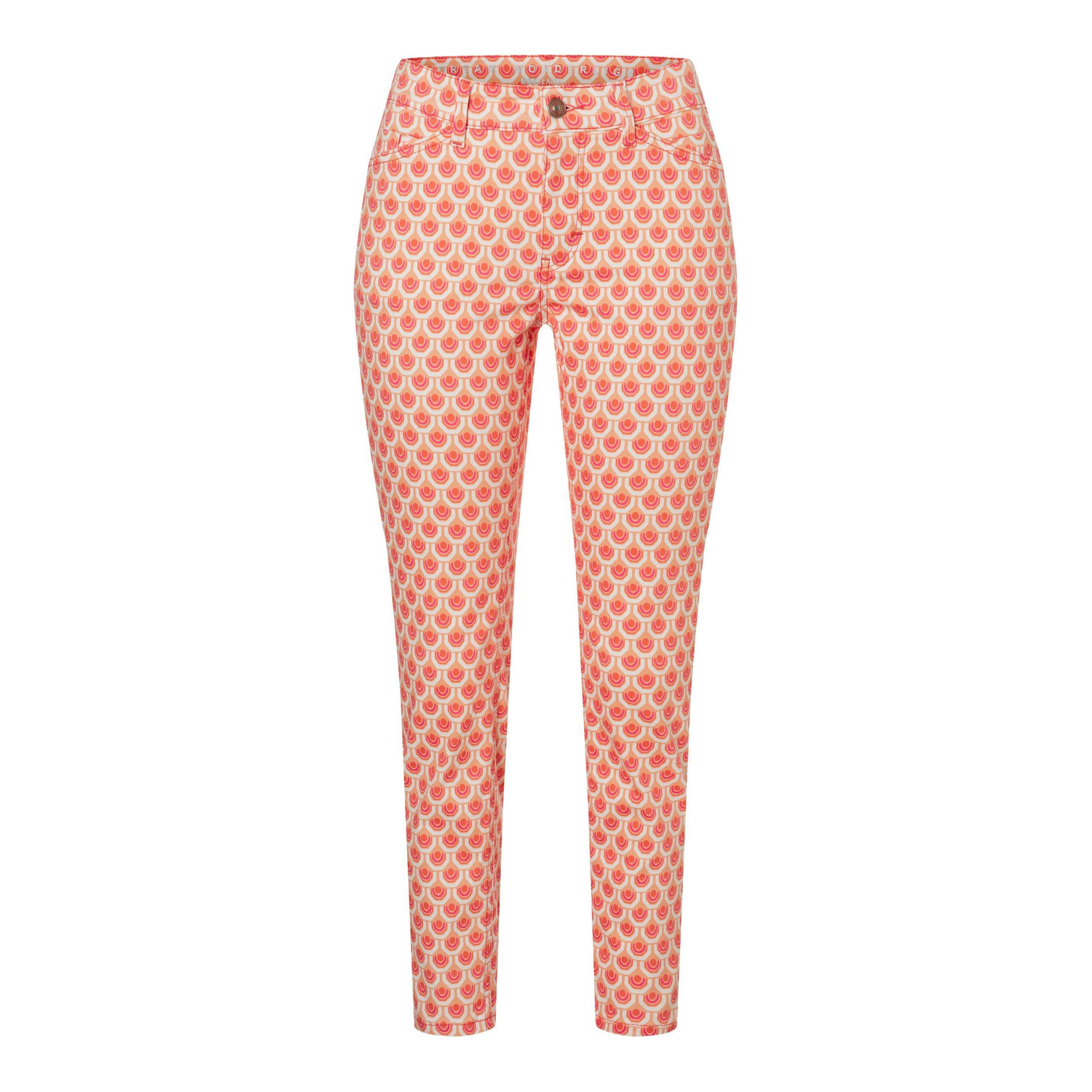 Cropped pantalon van MAC, model Dream Summer, slim leg in papaya orange figured. Deze 7/8 broek is gemaakt van een katoenen stretch stof (wonderlight), heeft een normale taille en kleine splitjes aan het einde van de broekspijpen. De pantalon sluit met een knoop- en ritssluiting, heeft twee steekzakken en twee achterzakken.