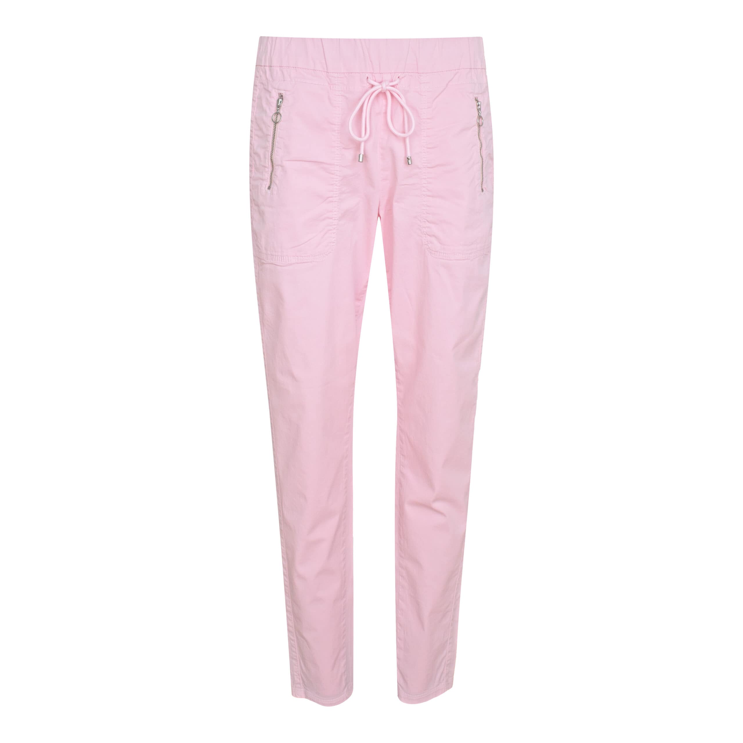 Roze katoenen pantalon van MAC, model Easy active. Deze broek is gemaakt van een katoenen stretch stof en heeft een slim fit pasvorm. De pantalon heeft twee zakken achter een ritssluiting en een elastische taille met een decoratief trekkoord.