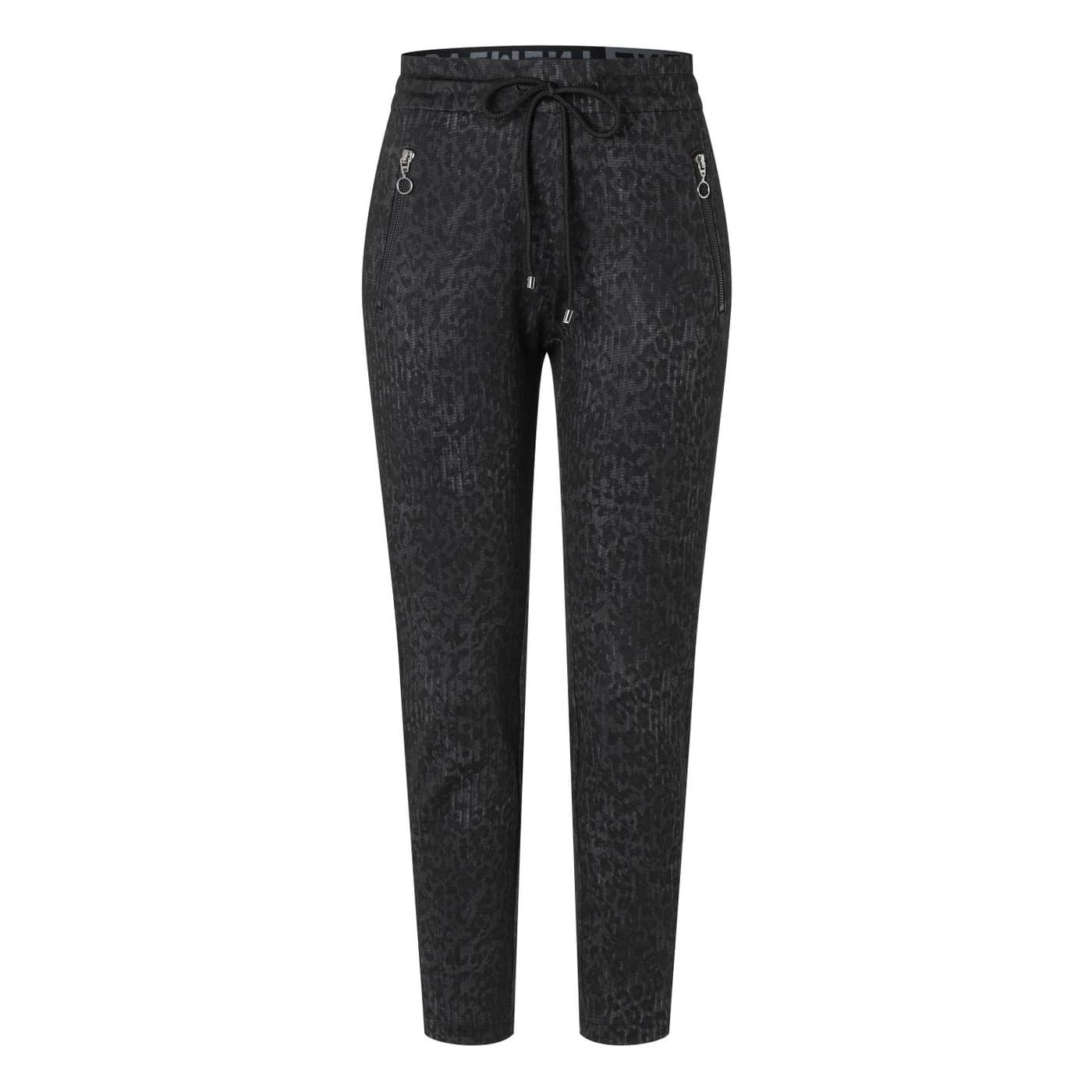 Relaxte pantalon van MAC, model Easy smart in black leo. Deze broek is gemaakt van een jersey stof en heeft twee zakken achter een ritssluiting. De pantalon heeft een elastische taille met trekkoord en een slim fit pasvorm.