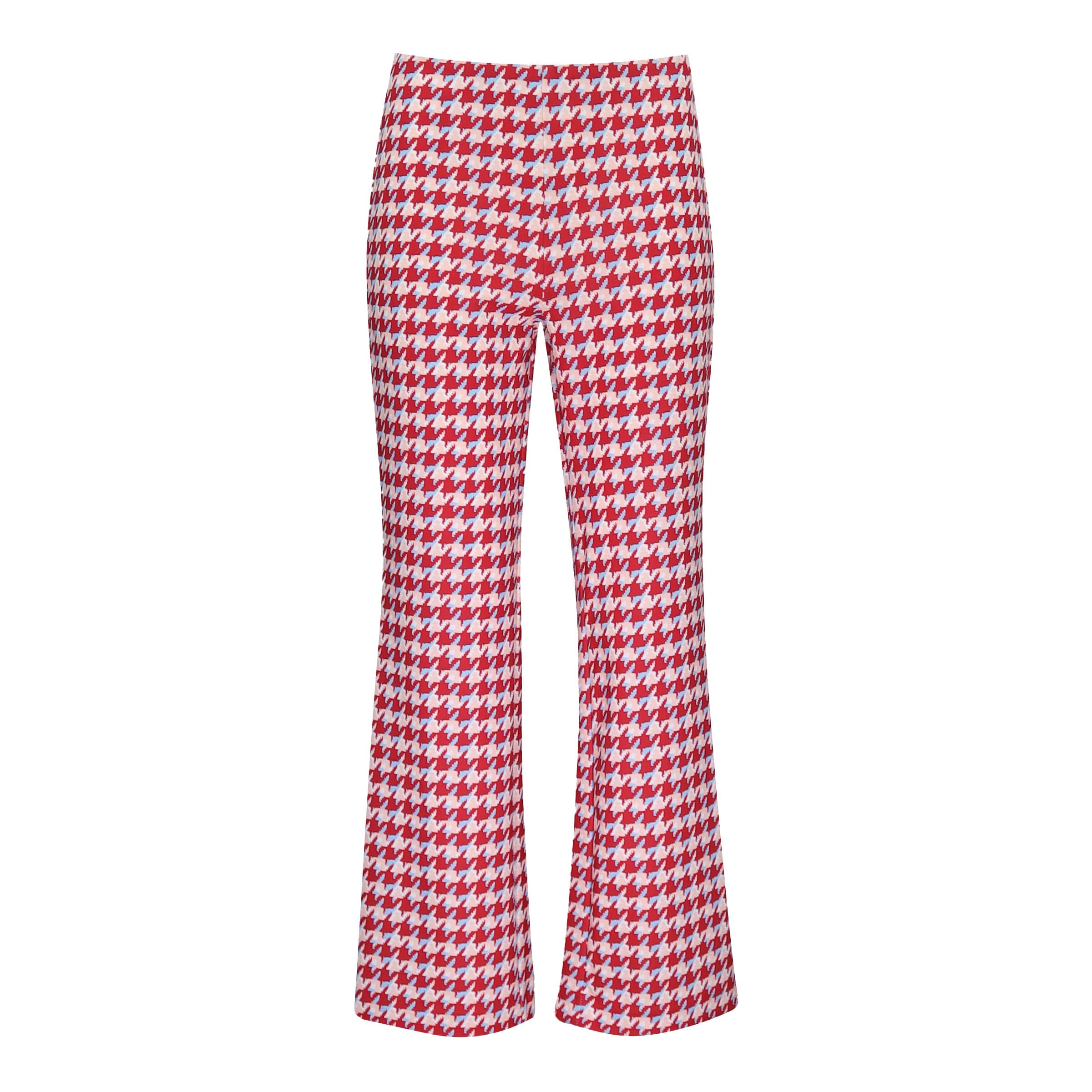 Rood roze pantalon van MAC, model Flare Kick. Deze jersey broek is gemaakt van een rood met roze gladde stretch stof met een motief, heeft licht uitlopende broekspijpen en valt boven de enkels. De pantalon heeft een slim fit pasvorm, normale taille en een elastische tailleband.