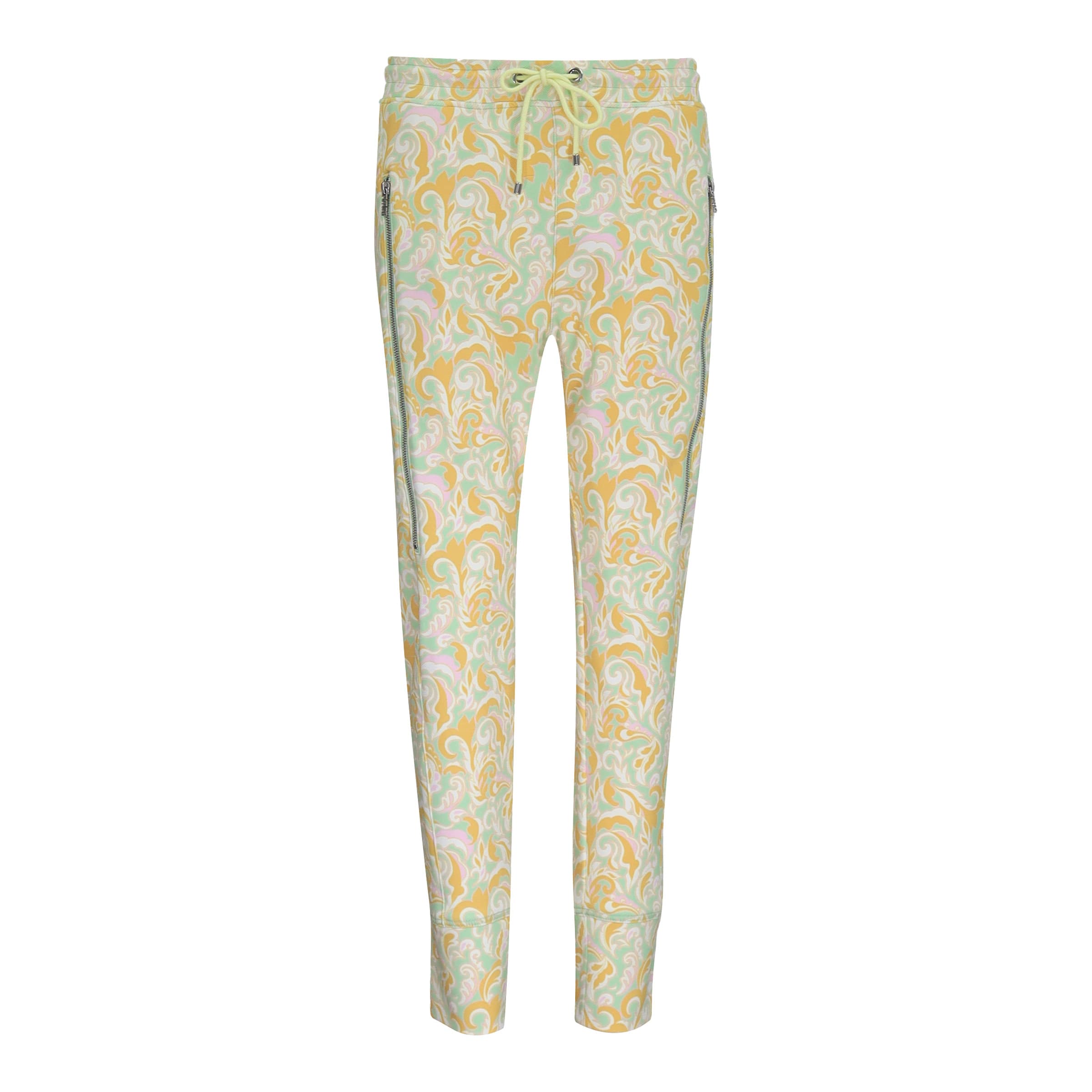Relaxte pantalon van MAC, model Future 2.0. Deze broek is gemaakt van een fijn geribbelde, soepel vallende stretch stof met een groen, oranje en wit barok motief. De broek heeft een elastische tailleband met trekkoord, taps toelopende broekspijpen met twee zakken achter ritsjes aan de voorzijde en een relaxed slim fit pasvorm.