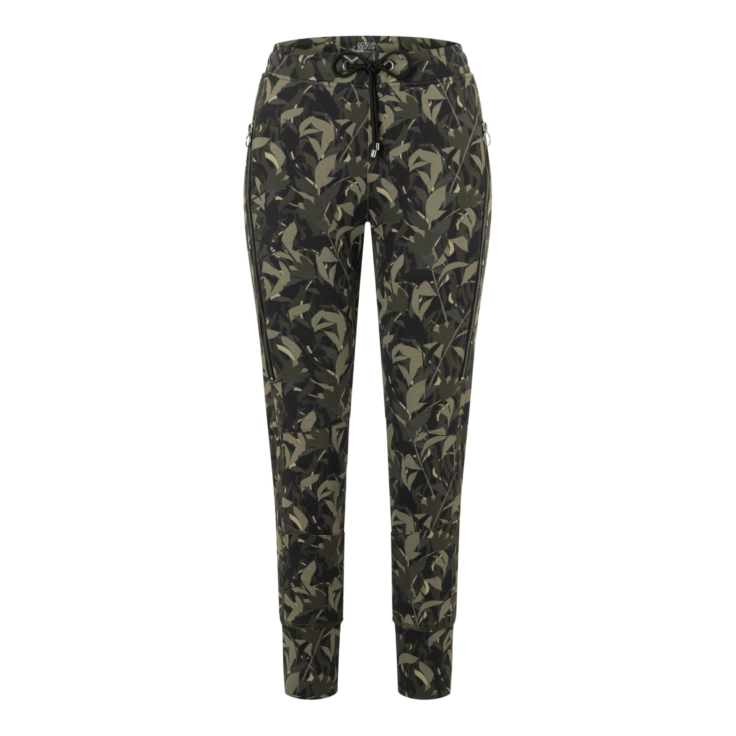Relaxte pantalon van MAC Jeans, model Future 2.0 in dark hunt green printed. Deze broek is gemaakt van een soepel vallende stof met camouflage motief en heeft een elastische tailleband met trekkoord. De broek heeft taps toelopende broekspijpen met twee zakken achter ritsjes aan de voorzijde.