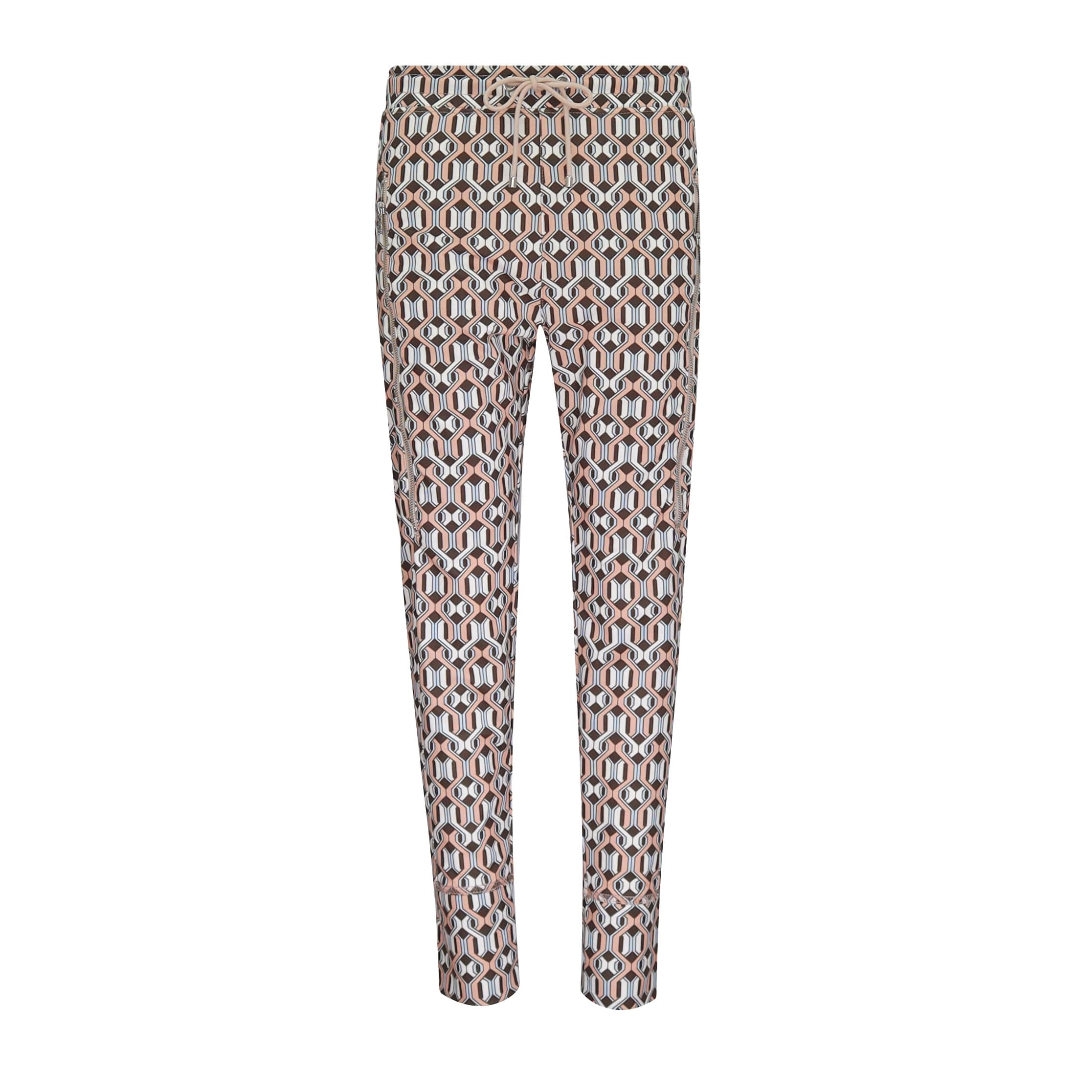 Relaxte pantalon van MAC, model Future 2.0. Deze broek is gemaakt van een soepel vallende stretch stof met een zwart, wit, roze en lichtblauw geografisch motief. De broek heeft een elastische tailleband met trekkoord, taps toelopende broekspijpen met twee zakken achter ritsjes aan de voorzijde en een relaxed slim fit pasvorm.