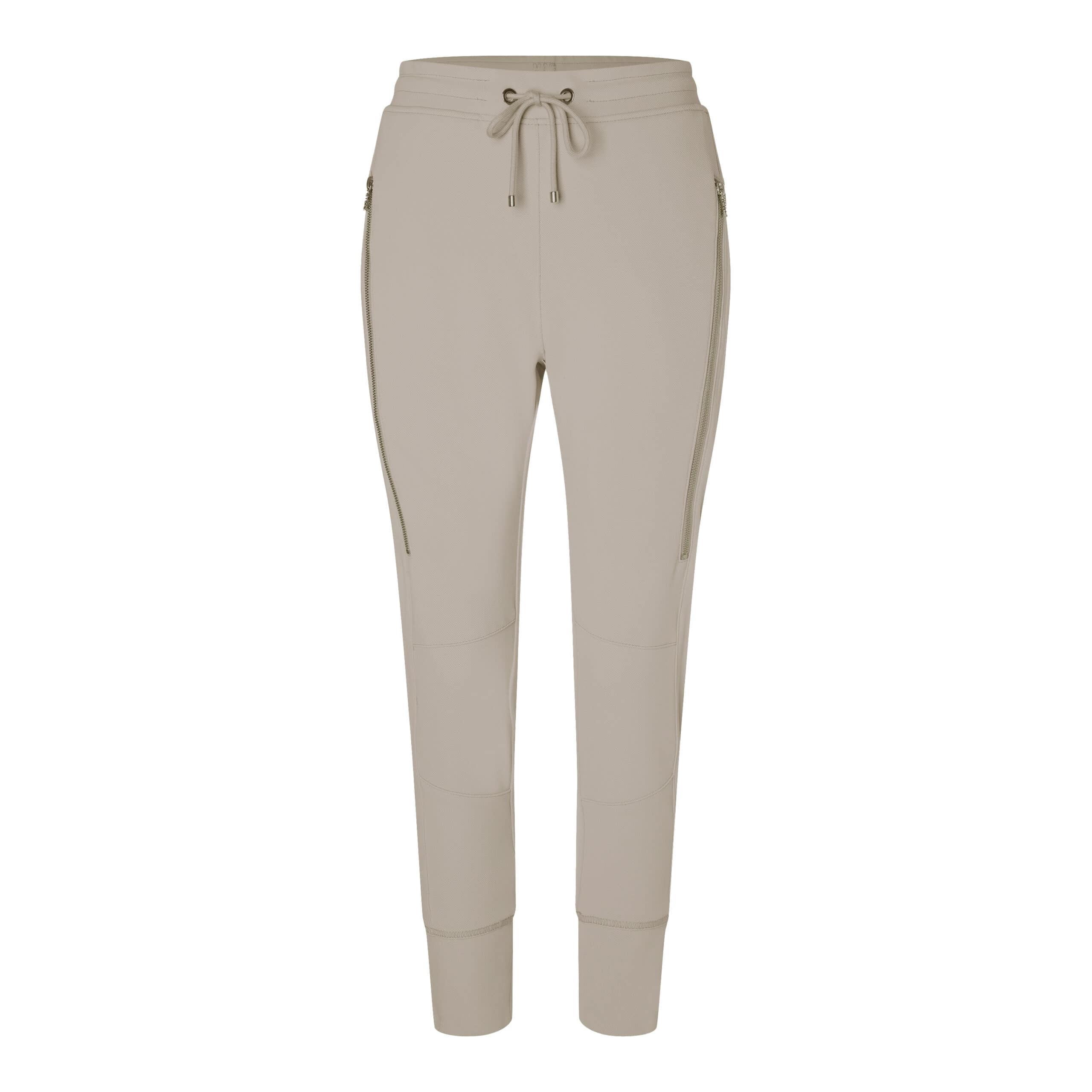 Relaxte pantalon van MAC Jeans, model Future 2.0. Deze broek is gemaakt van een soepel vallende grijze stof en heeft een elastische tailleband met trekkoord. De broek heeft taps toelopende broekspijpen met twee zakken achter ritsjes aan de voorzijde.
