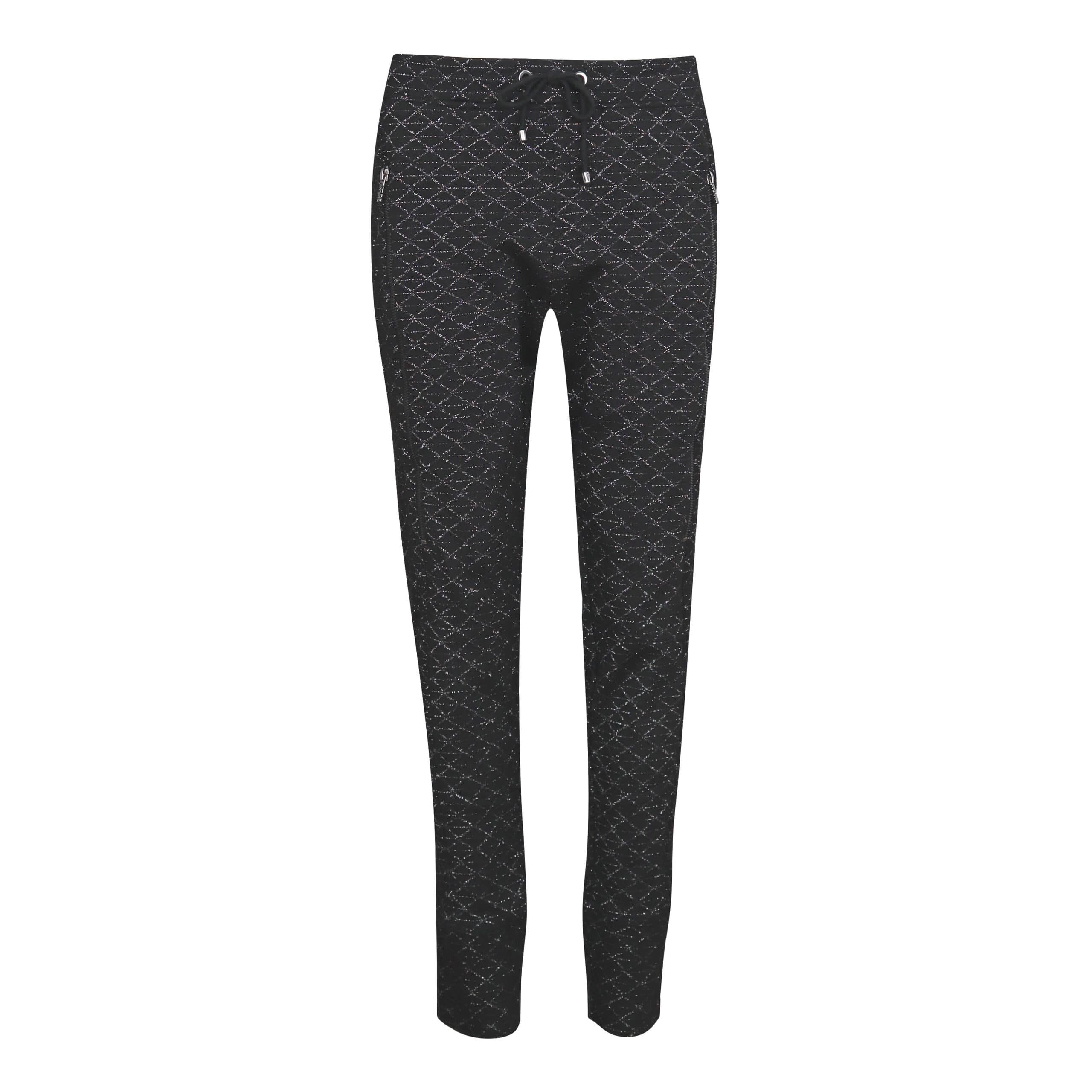 Relaxte pantalon van MAC, model Future 2.0. Deze broek is gemaakt van een zwarte soepel vallende stretch stof met een zilver geruit motief. De broek heeft een elastische tailleband met trekkoord, taps toelopende broekspijpen met twee zakken achter ritsjes aan de voorzijde en een relaxed slim fit pasvorm.