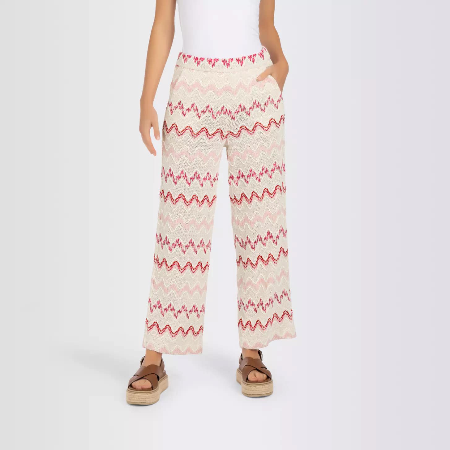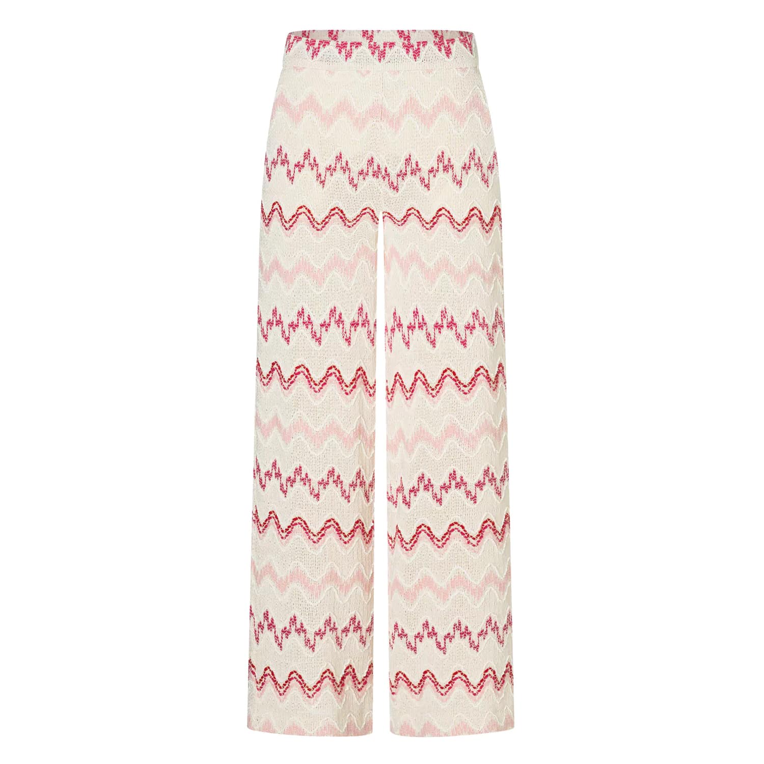 Gehaakte palazzo pantalon van MAC, model Palazzo in summer bouclé. Deze pantalon is gemaakt van een licht beige stof met hierin een roze zigzag motief. De crochet broek heeft een normale taille met een rechte wijde broekspijpen, twee steekzakken en een elastische taille.
