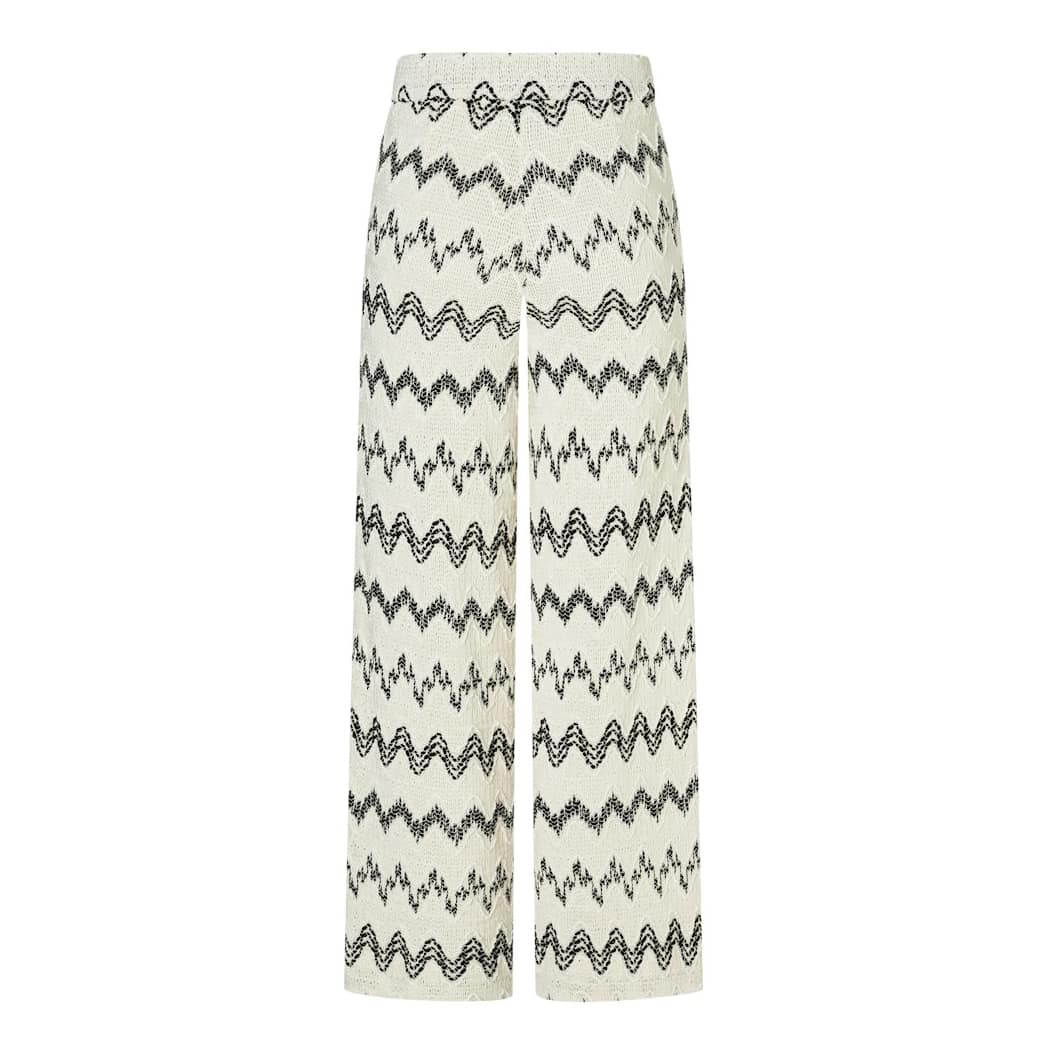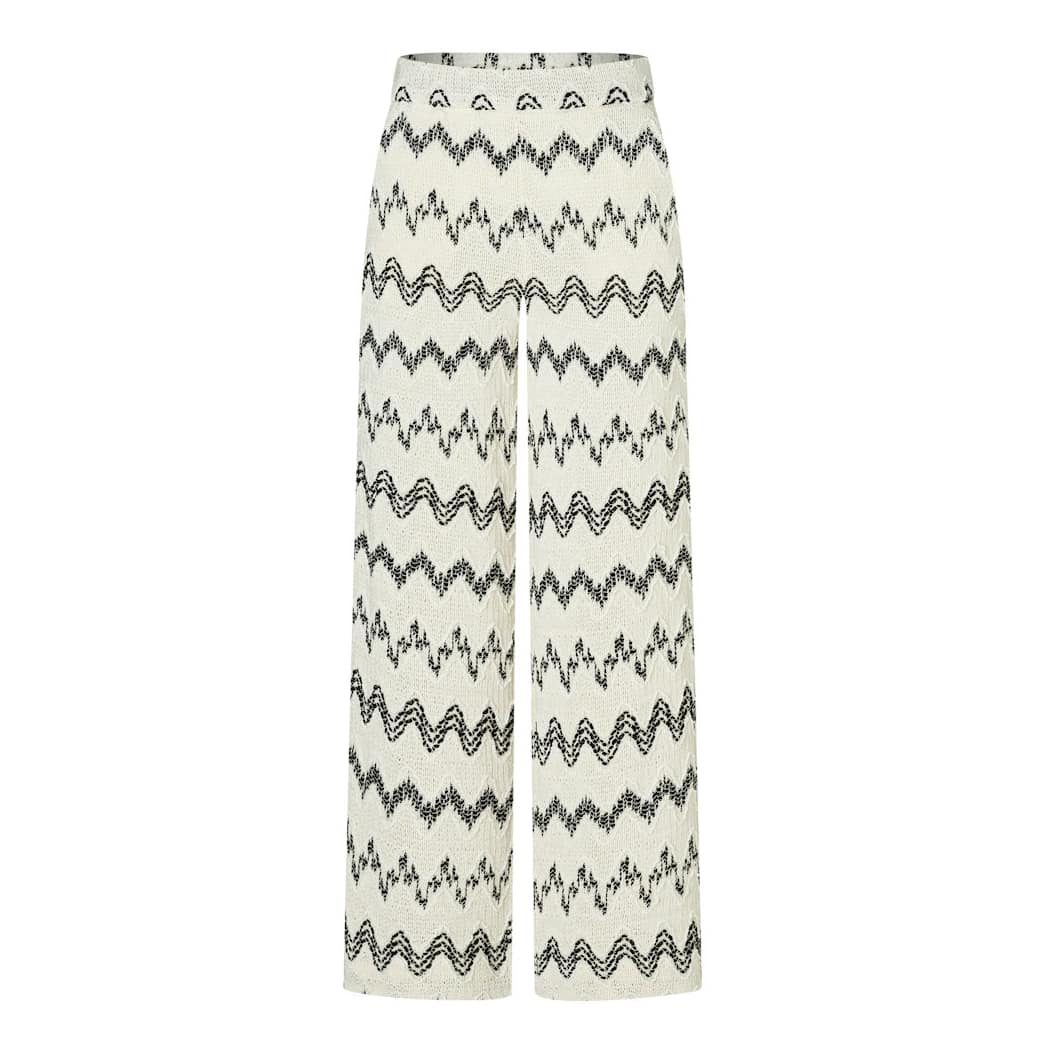 Gehaakte palazzo pantalon van MAC, model Palazzo in summer bouclé. Deze pantalon is gemaakt van een licht beige stof met hierin een zwart zigzag motief. De crochet broek heeft een normale taille met een rechte wijde broekspijpen, twee steekzakken en een elastische taille.