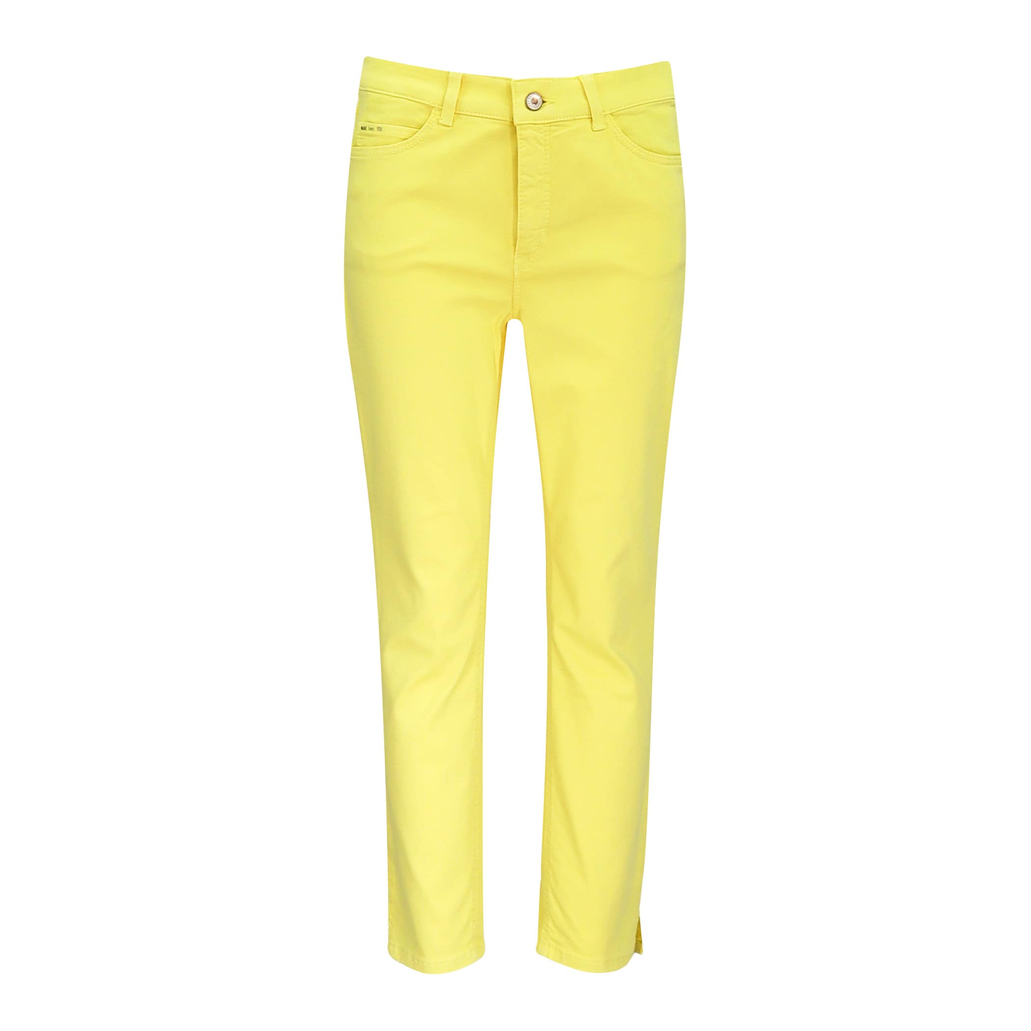 Gele pantalon van MAC, model Dream Summer cotton, slim leg. Deze 7/8 broek is gemaakt van een effen gele katoenen stretch stof, heeft een normale taille en kleine splitjes aan het einde van de broekspijpen. De pantalon sluit met een knoop- en ritssluiting, heeft twee steekzakken en twee achterzakken.