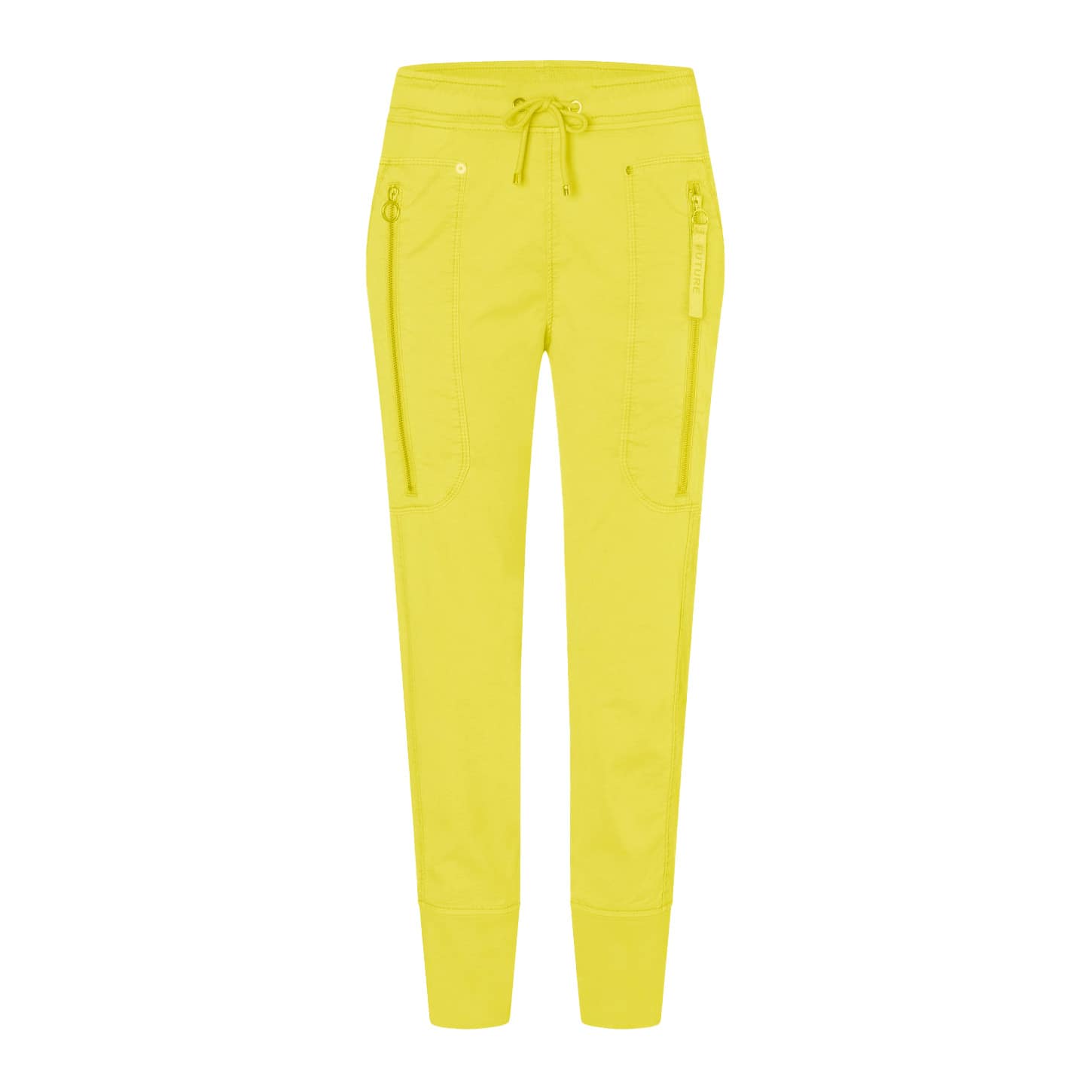Relaxte pantalon van MAC, model Future 2.08 casual. Deze gele broek heeft taps toelopende broekspijpen met twee zakken achter ritsjes aan de voorzijde. De broek is gemaakt van een soepel vallende katoenen stretch stof en heeft een elastische tailleband met trekkoord.