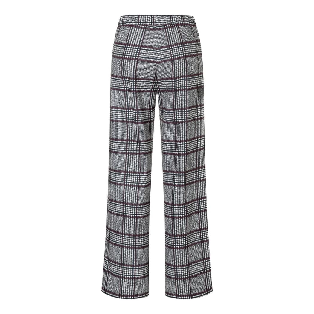 Geruite pantalon van MAC, model Chiara. Deze relaxte pantalon is gemaakt van een geruite zwart, witte stretch stof met een bordeaux rode streep en heeft rechte, wijde broekspijpen. De losvallende lange broek heeft een elastische taille en twee steekzakken.