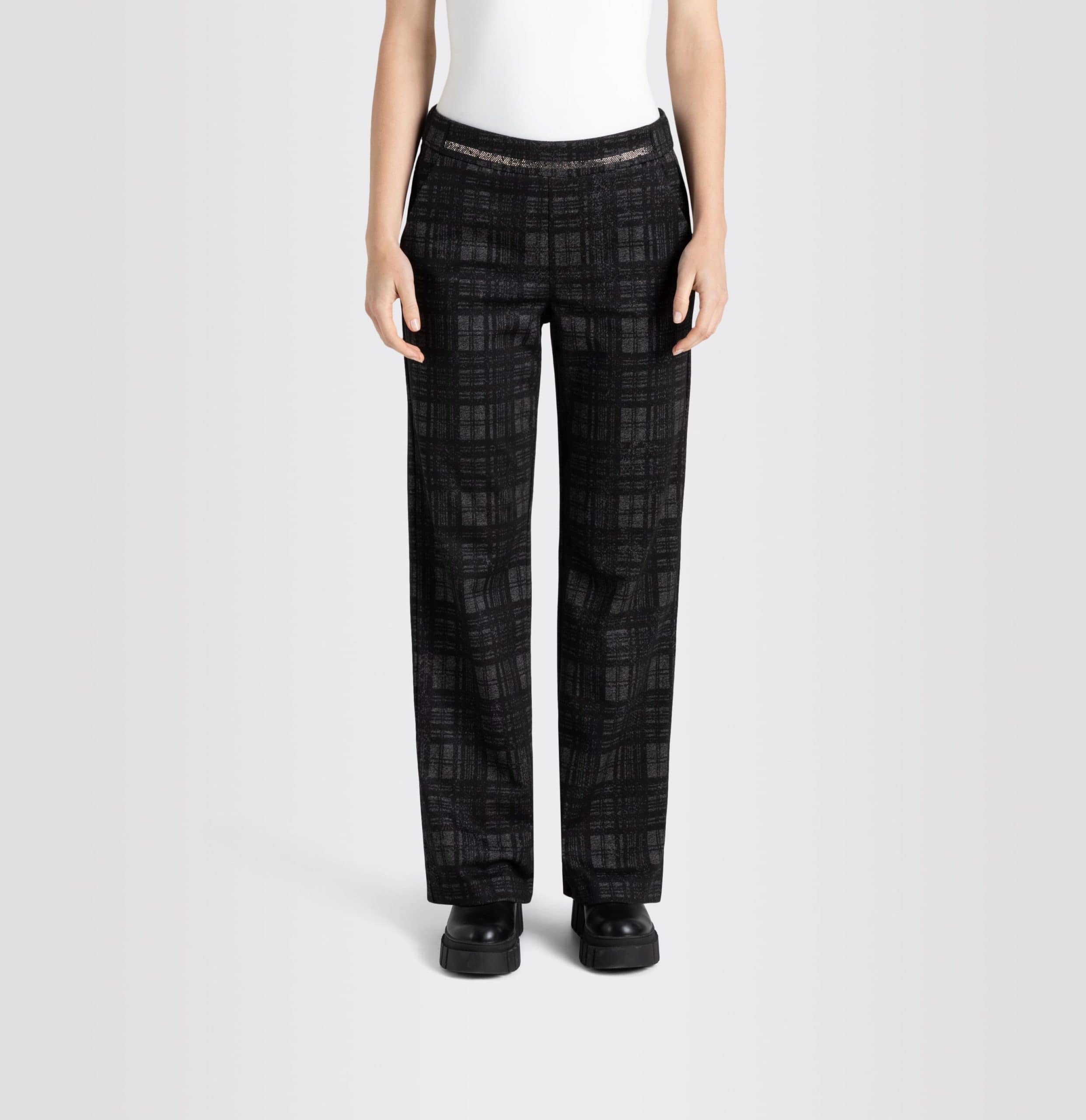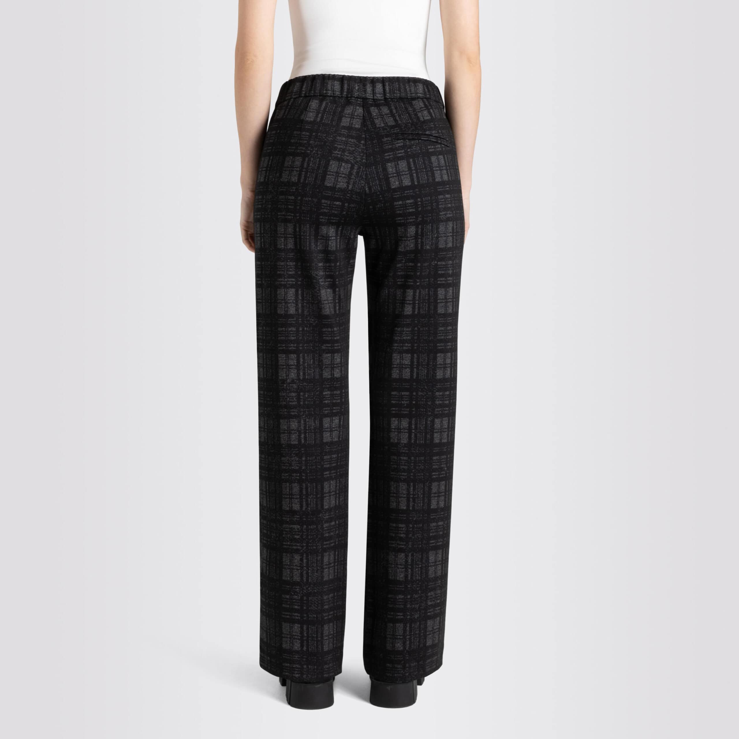 Geruite donkergrijze pantalon van MAC, model Chiara in vintage grey check. Deze relaxte pantalon is gemaakt van een jersey stretch stof en heeft wijde rechte broekspijpen. De losvallende lange broek heeft een elastische taille met aan de voorzijde decoratieve steentjes en twee steekzakken.