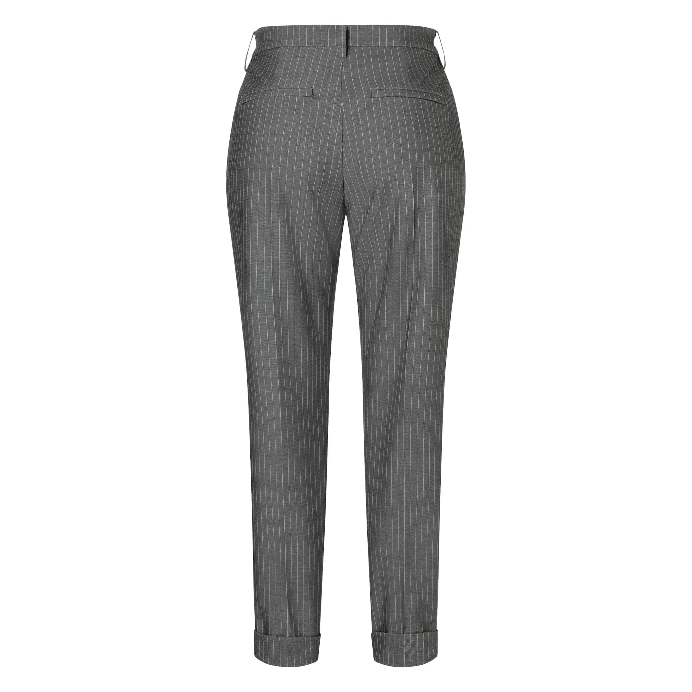 Grijze, gestreepte chino van MAC, model Chino turn up in anthracite stripes. Deze pantalon is gemaakt van een bi-stretch stof, heeft een slim fit pasvorm, vaste omslag onderaan de broekspijpen en valt tot op de enkels. De broek sluit met een knoop- en ritssluiting, heeft twee steekzakken aan de voorzijde en twee sier paspelzakjes.