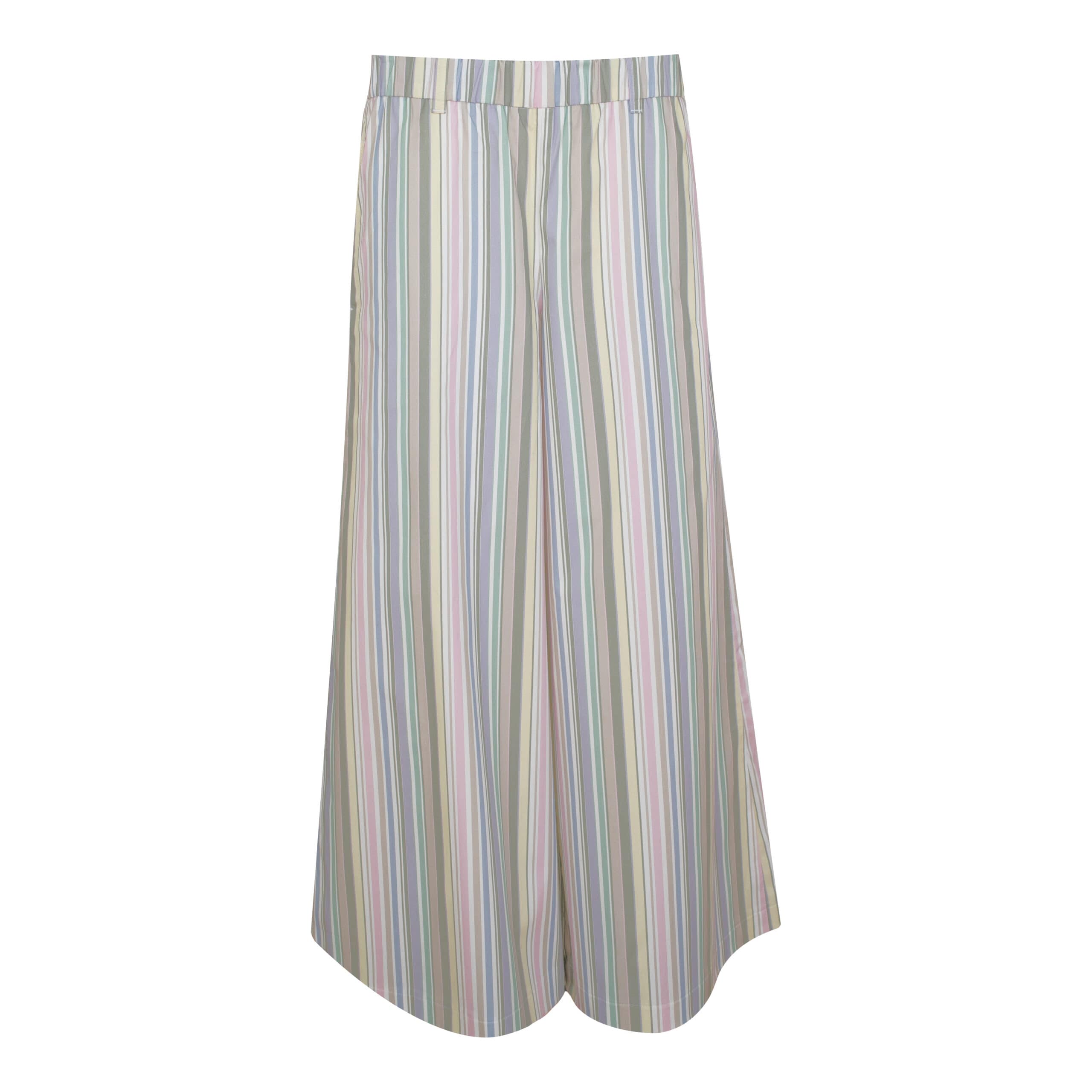 Wijde pantalon van MAC, model Culotte summer. Deze broek is gemaakt van een stof met gestreepte pastel tinten. De broek heeft wijde uitlopende broekspijpen, een elastische taille en twee steekzakken.