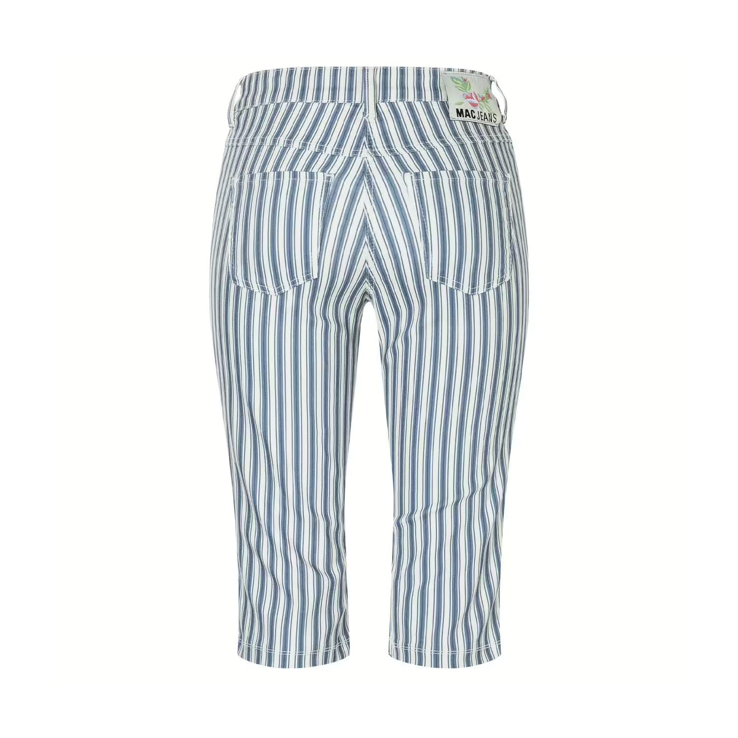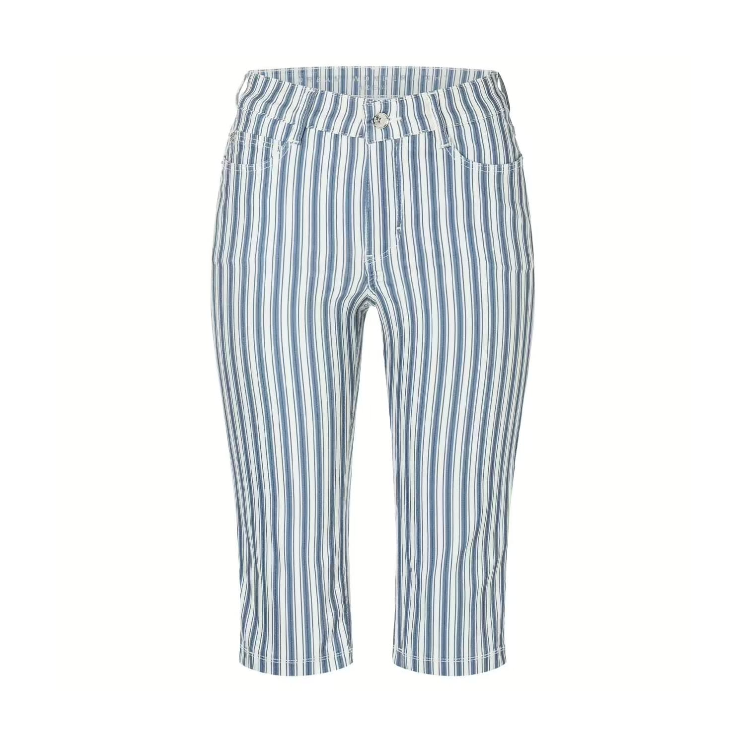Gestreepte capri jeans van MAC, model Dream Sun in bright cobalt. Deze broek is gemaakt van een blauw witte stretch denim (wonderlight) en valt net onder de knie. De broek sluit met een knoop- en ritssluiting en heeft twee steekzakken aan de voorzijde en twee achterzakken.