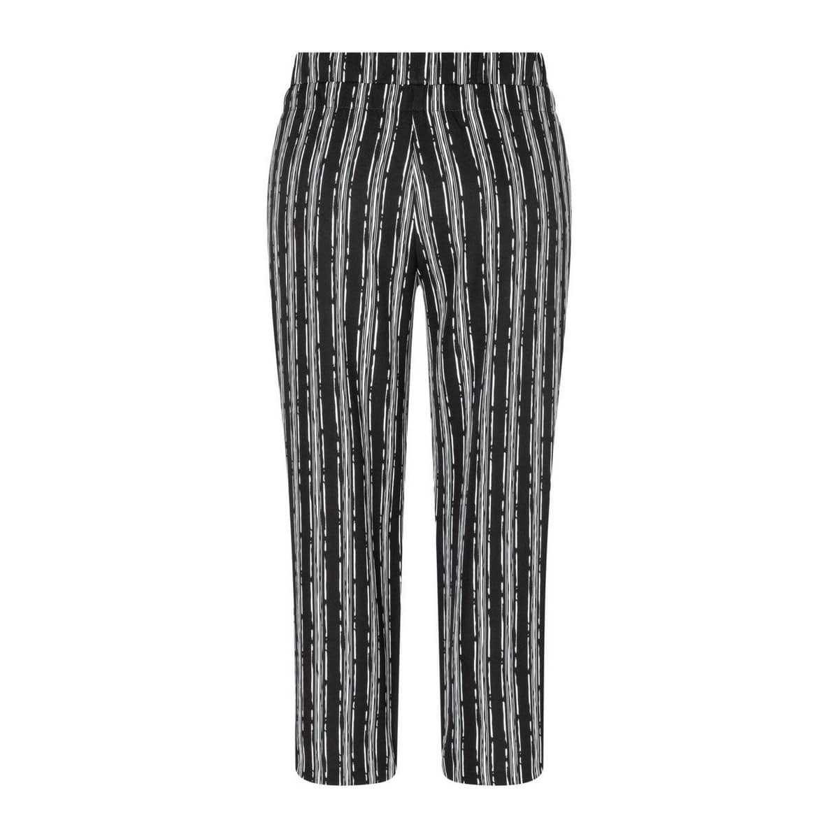 Wijde pantalon van MAC Jeans, model Easy Culotte. Deze zwarte broek heeft witte verticale strepen met wijde rechte broekspijpen. De broek heeft een elastische tailleband met een elastische sluiting en twee steekzakken aan de voorzijde.