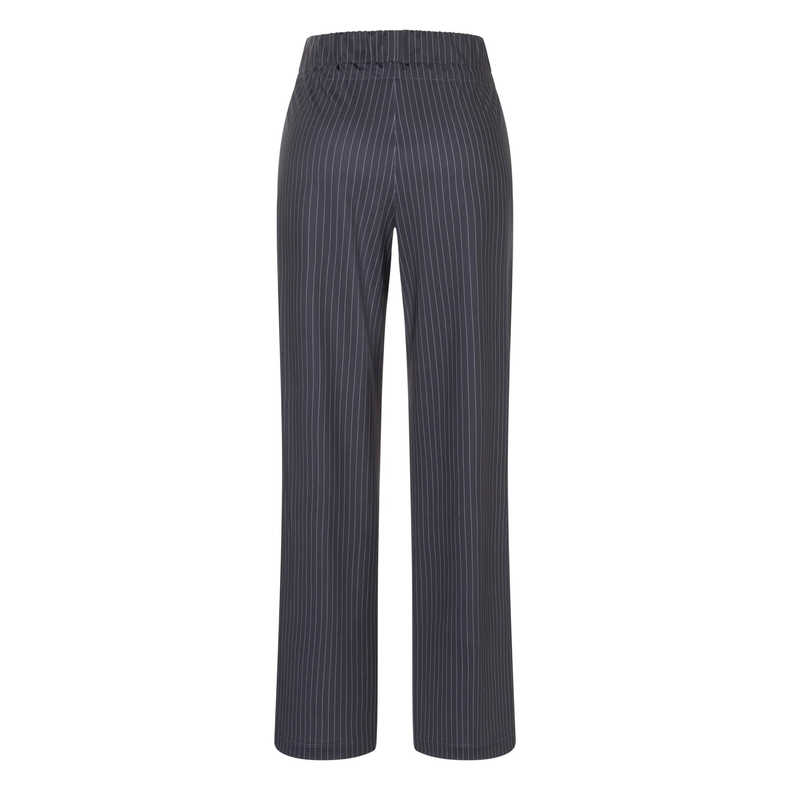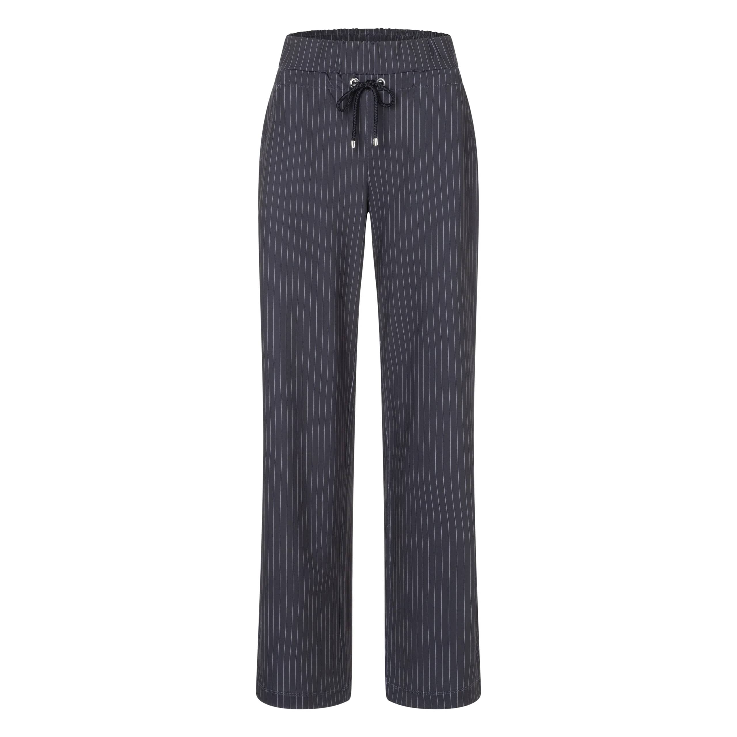 Donkerblauwe gestreepte pantalon van MAC, model Easy wideleg in nightshade blue. Deze relaxte broek is gemaakt van een gladde, premium techno stretch stof en heeft rechte, wijde broekspijpen. De losvallende broek heeft een elastische taille met trekkoord en twee steekzakken.
