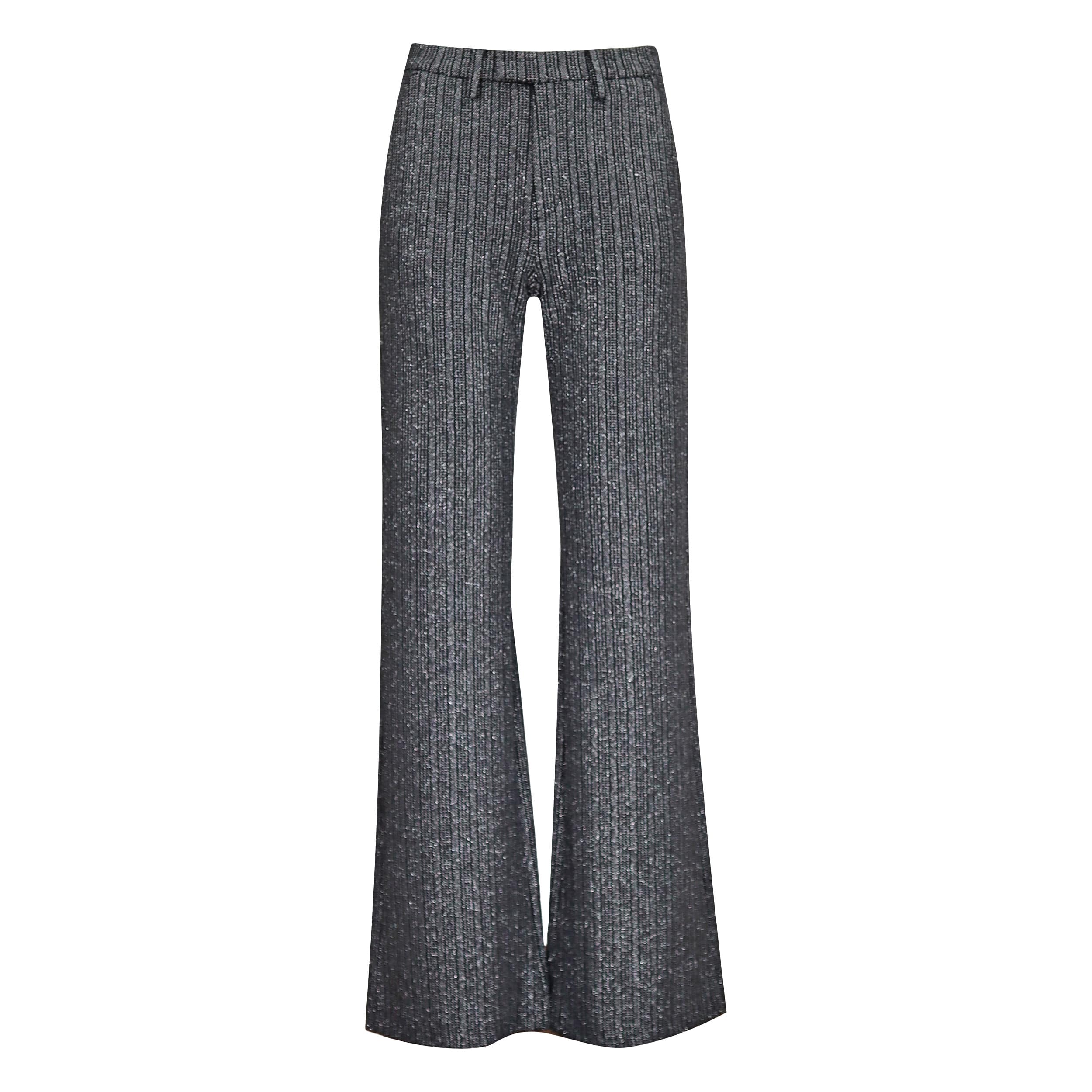 Zwart zilveren pantalon van MAC, model Joana. Deze broek is gemaakt van een luxury jersey stretch stof met zilveren verticale strepen en heeft een hogere taille. De pantalon heeft lange iets uitlopende broekspijpen, sluit met een knoop, haakje en ritssluiting, heeft twee steekzakken en twee sier paspelzakken.