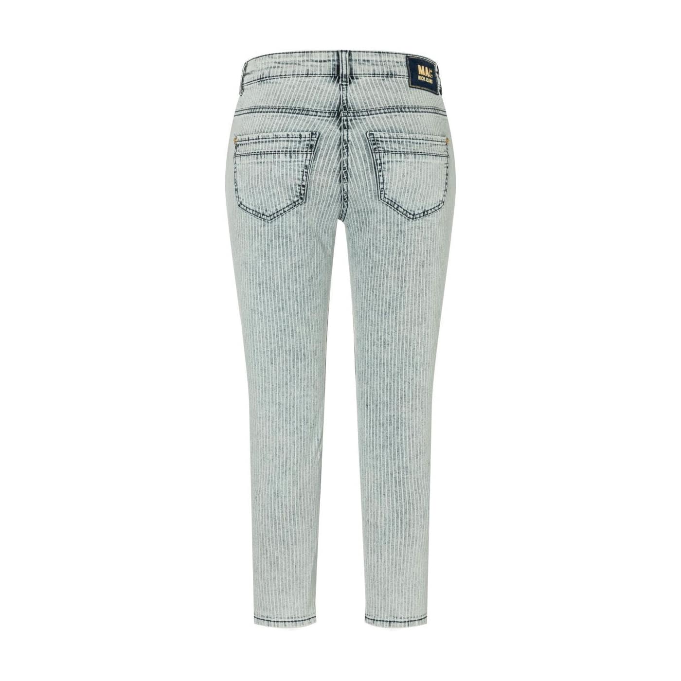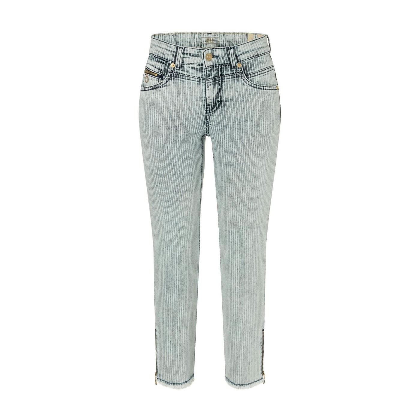 Gestreepte jeans van MAC, model Rich Slim Chic straight fit slim leg. Deze 7/8 denim broek heeft een slim fit pasvorm met twee steekzakken aan de voorzijde en twee achterzakken. De spijkerbroek is gemaakt van een denim stretch stof met een licht vervaagd gestreept motief, sluit met een knoop- en ritssluiting. De onderzijde van de broekspijpen zijn ingesprongen en hebben een ritsje aan de zijkant.
