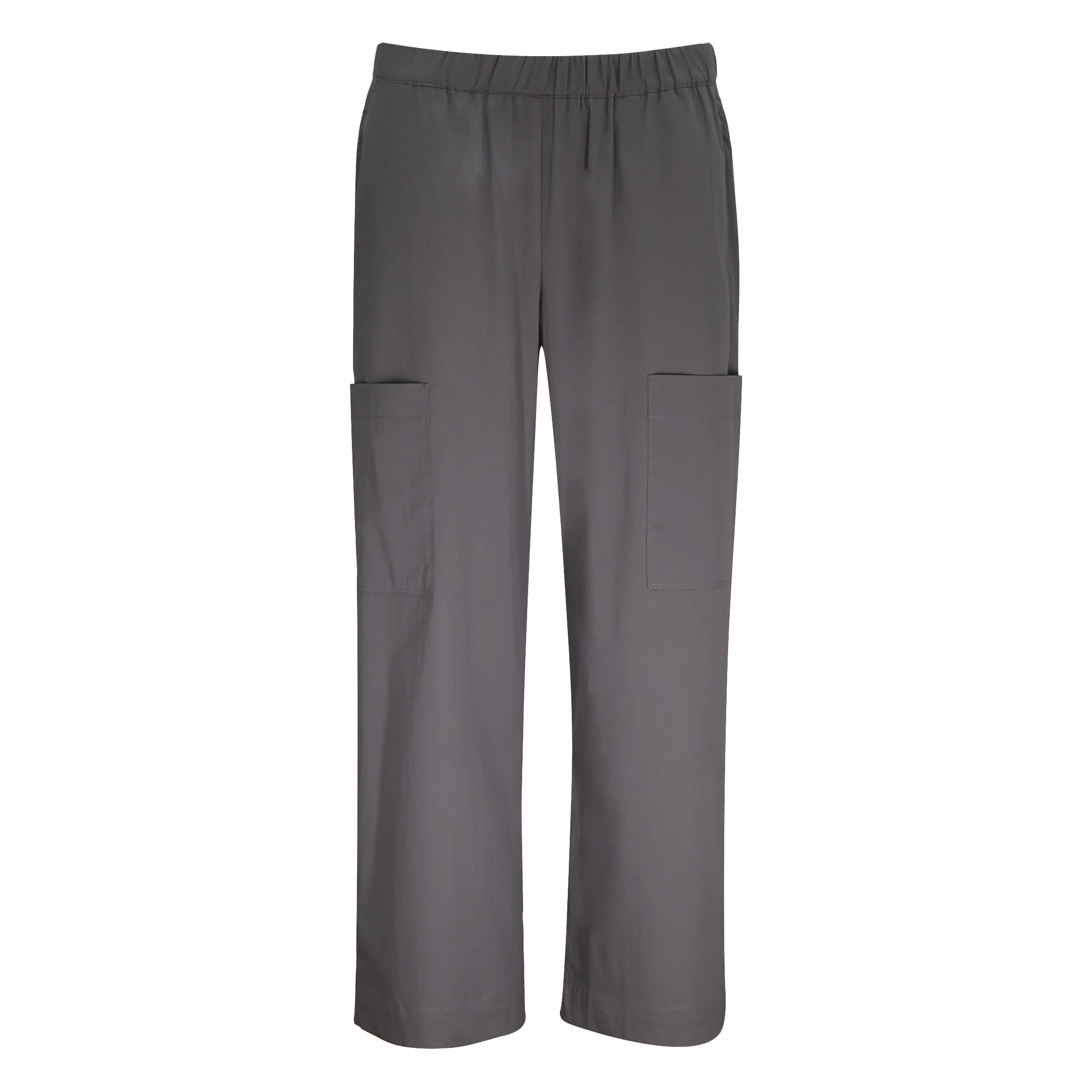 Grijze culotte pantalon van MAC, model Steffi Cargo. Deze relaxte 7/8 pantalon is gemaakt van een dunne effen grijze stof met stretch, heeft twee cargo zakken en wijde rechte broekspijpen. De los vallende broek heeft een elastische taille en valt boven de enkels.