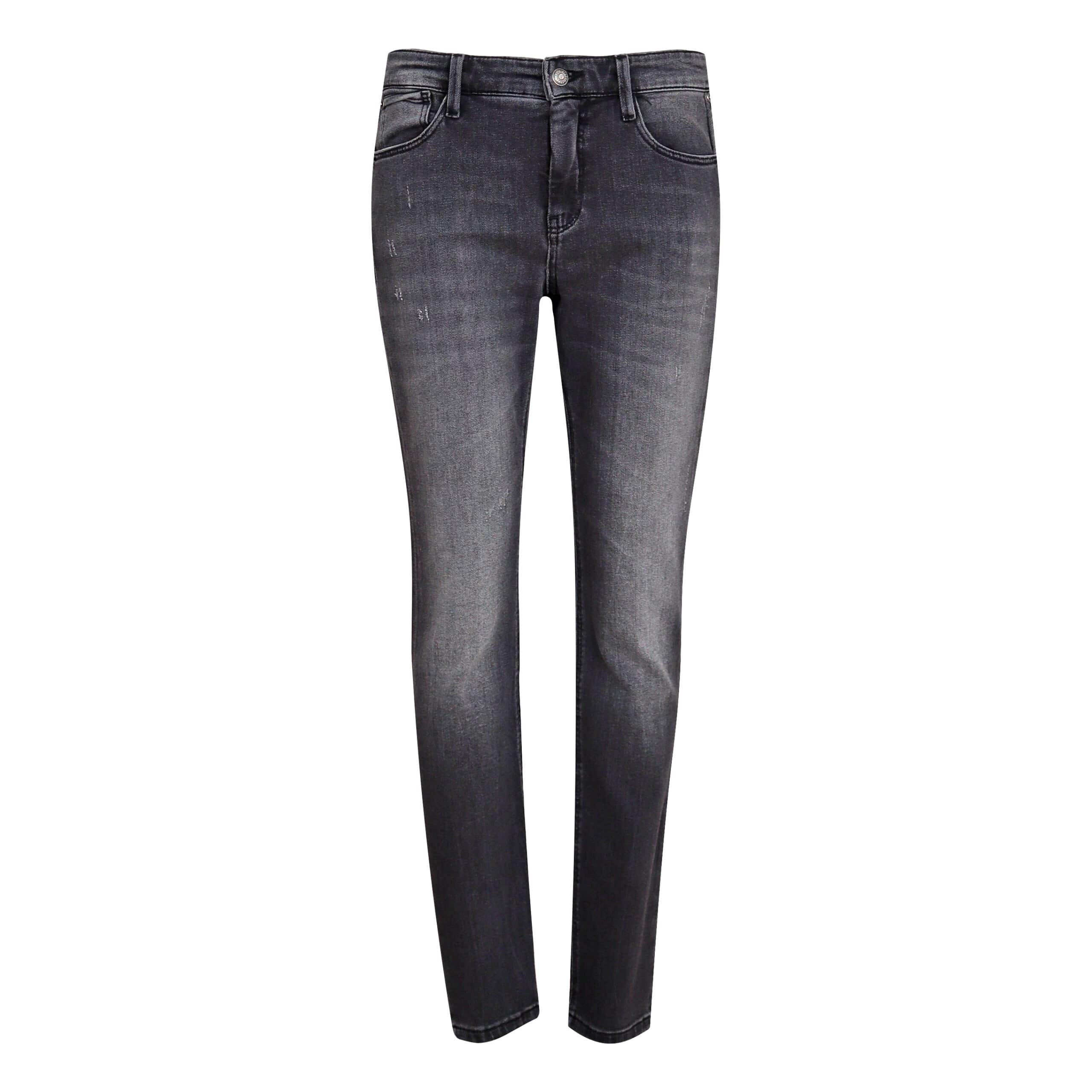 Grijze jeans van MAC, model California Slim, slim fit, low rise, 5-pocket. Deze broek is gemaakt van stretch denim met lichte beschadigingen, heeft een normale taille en een slim fit pasvorm. De broek  sluit met een knoop- en ritssluiting, heeft twee steekzakken en twee achterzakken.