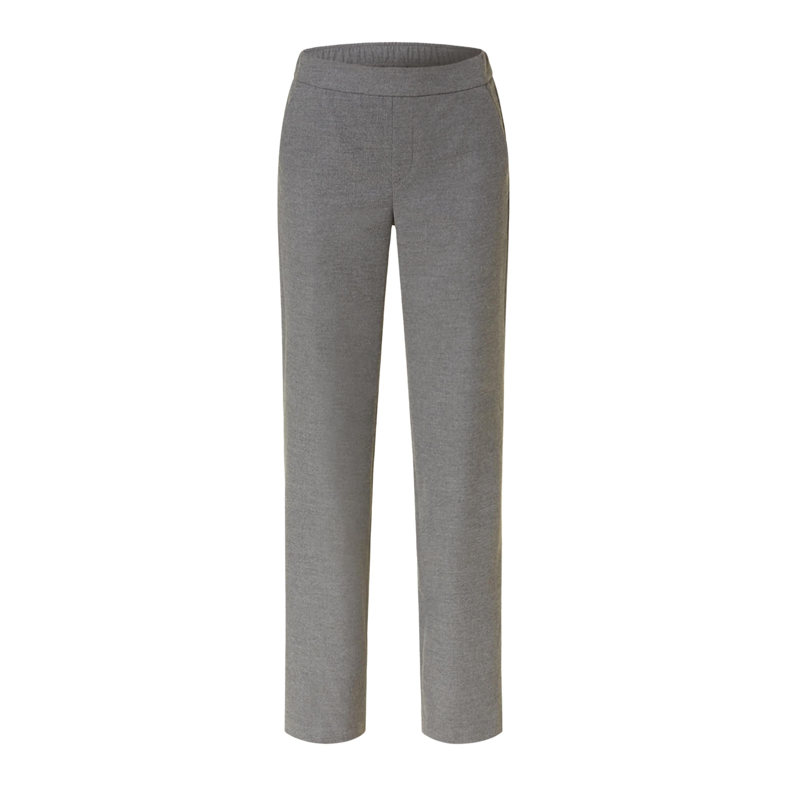 Grijze pantalon van MAC, model Chiara. Deze relaxte pantalon is gemaakt van een wol look stof en heeft wijde, rechte broekspijpen. De los vallende lange broek heeft een elastische taille en twee steekzakken.