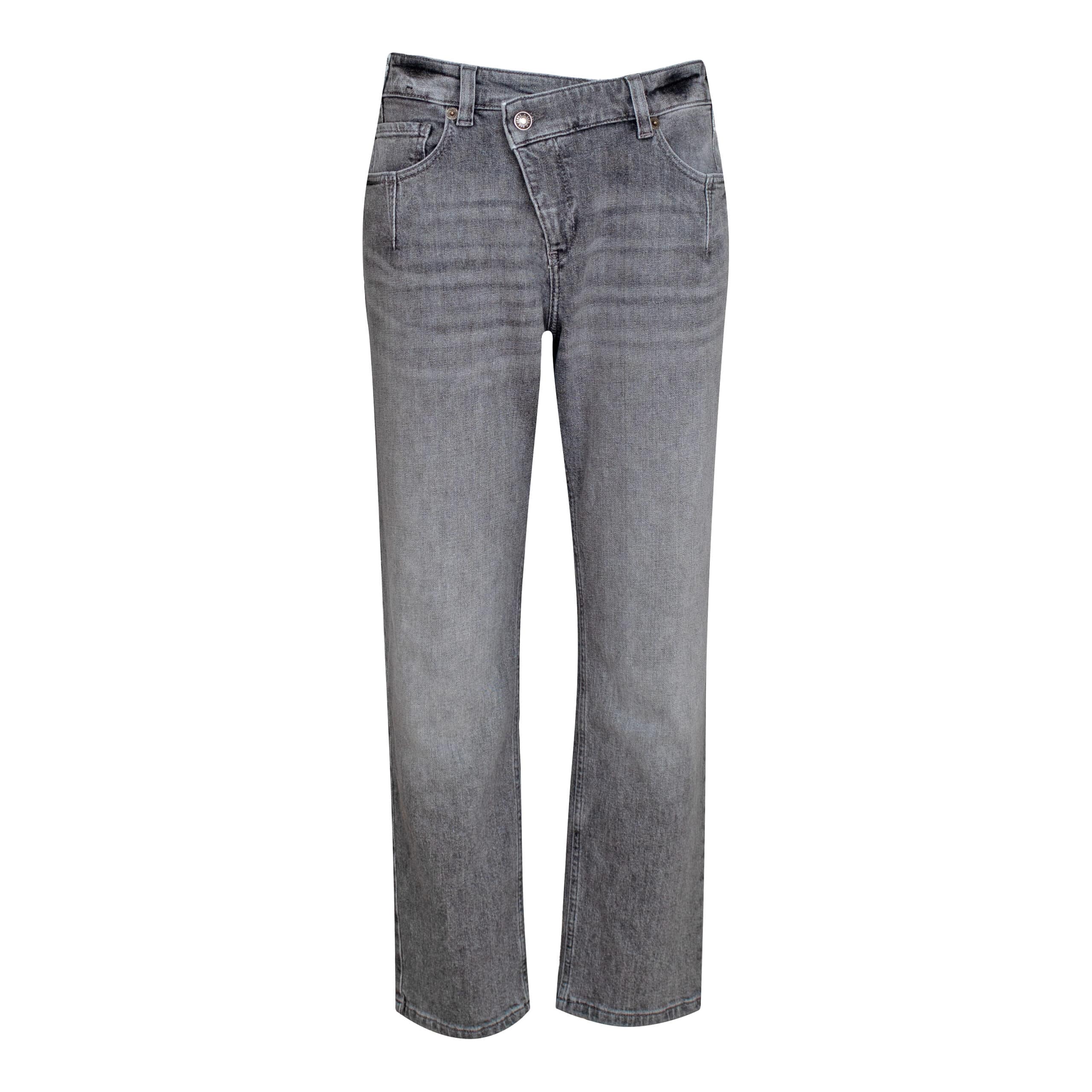 Grijze jeans van MAC, model Criss Cross, straight fit, straight leg. Deze broek is gemaakt van stretch denim en heeft een rechte pasvorm. De jeans heeft een asymmetrische knoop- en ritssluiting, normale taille, heeft twee steekzakken en twee achterzakken.