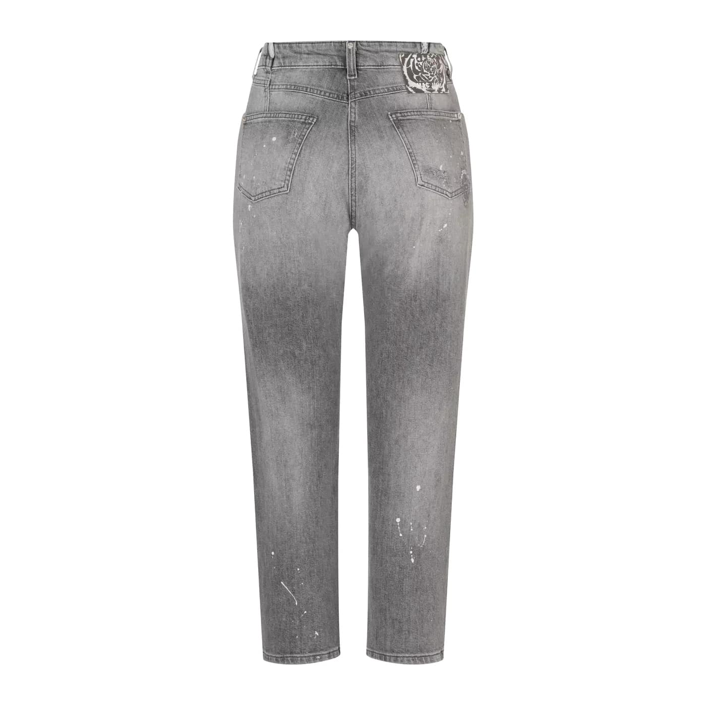 Grijze jeans van MAC, model Criss Cross shine, straight fit, straight leg. Deze broek is gemaakt van stretch denim met beschadigingen, witte verf spetters en strass steentjes. De jeans heeft een asymmetrische knoop- en ritssluiting, normale taille, heeft twee steekzakken en twee achterzakken.