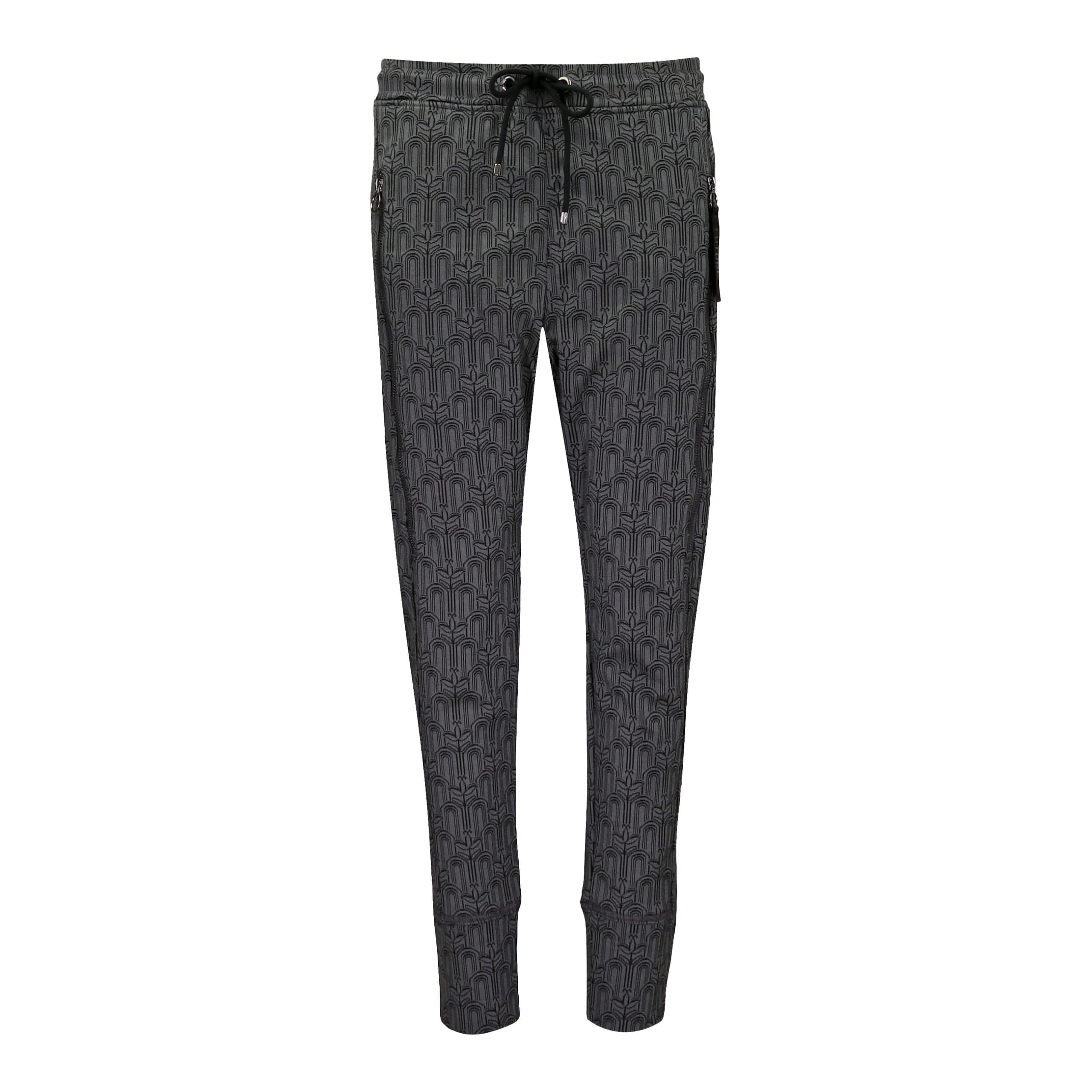 Relaxte pantalon van MAC Jeans, model Future 2.0. Deze broek is gemaakt van een soepel vallende grijze stof met een zwart motief en heeft een elastische tailleband met trekkoord. De broek heeft taps toelopende broekspijpen met twee zakken achter ritsjes aan de voorzijde.