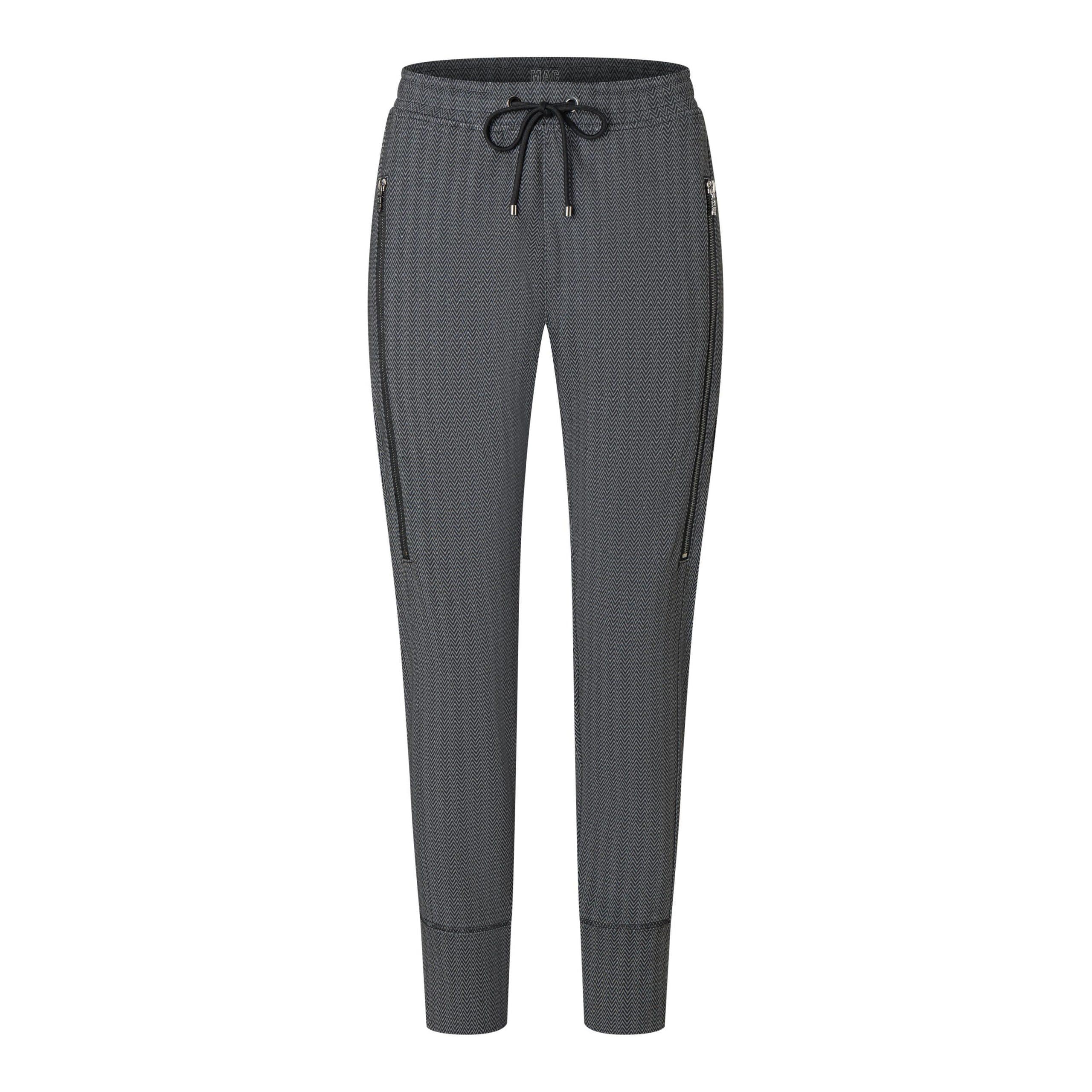 Relaxte pantalon van MAC, model Future 2.0 in platinum grey zig zag. Deze broek is gemaakt van een soepel vallende jersey stof met een zwart grijs zigzag motief en heeft een elastische tailleband met trekkoord. De broek heeft taps toelopende broekspijpen met twee zakken achter ritsjes aan de voorzijde.