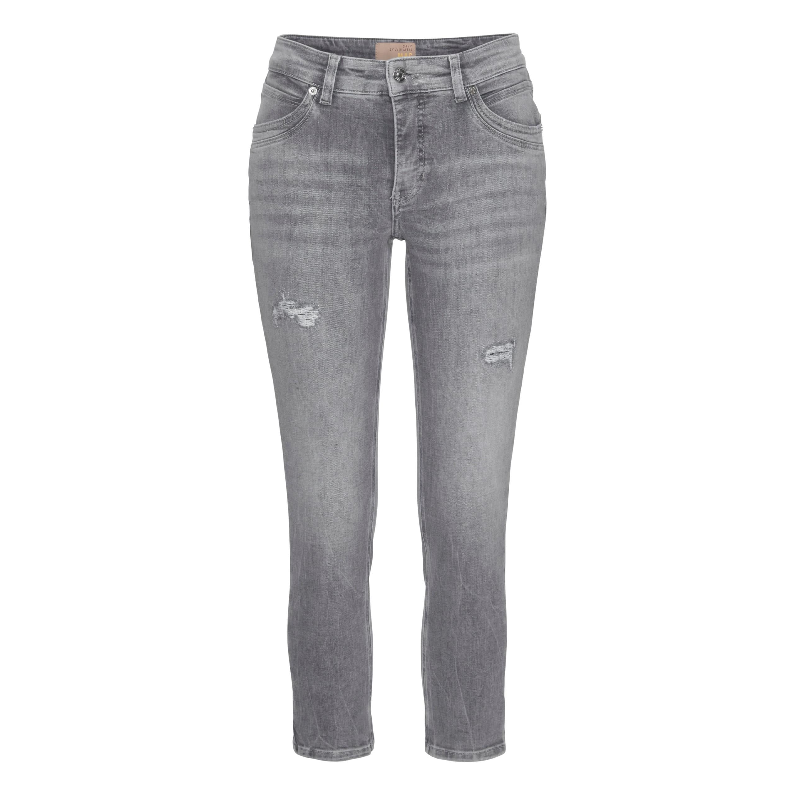 Grijze jeans van MAC x Sylvie Meis 24/7, model Mel feminine fit slim leg met beschadigingen in mid grey heavy destroyed. Deze denim broek heeft een iets verhoogde smalle taille met een slim fit pasvorm. De cropped jeans sluit met een knoop- en ritssluiting, heeft twee steekzakken en twee achterzakken.