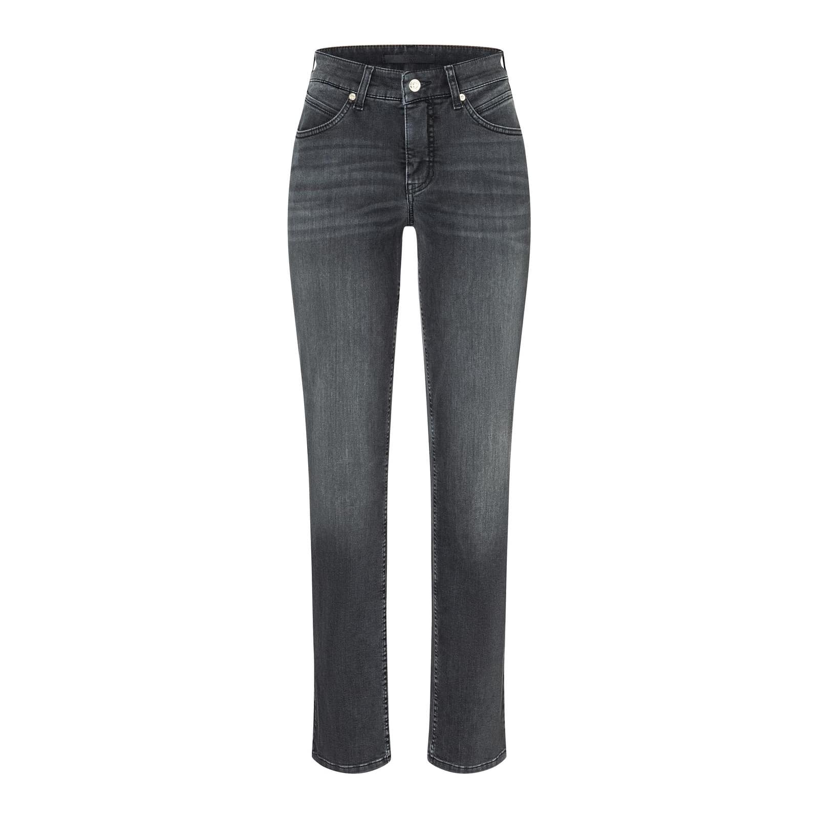 Grijze jeans van MAC, model Melanie, feminine fit, straight leg in fancy anthrazit wash. Deze rechte denim broek heeft twee steekzakken aan de voorzijde en twee achterzakken. De jeans is gemaakt van stretch denim, sluit met een knoop- en ritssluiting en heeft een normale taille.