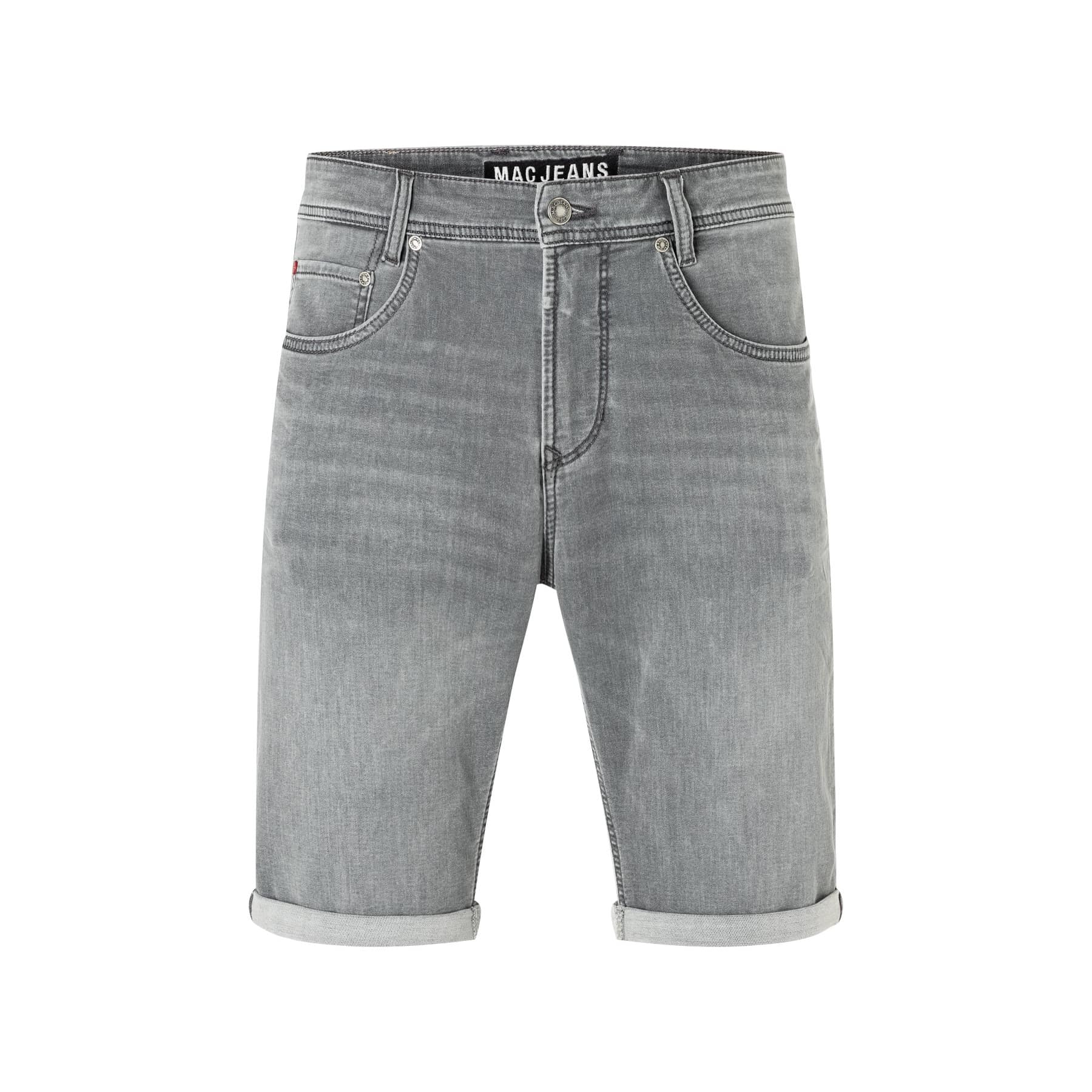 Grijze bermuda van MAC, model Jog’n Bermuda in light grey used. Deze short is gemaakt van een denim look jersey stretch stof. De korte broek sluit met een knoop- en ritssluiting, heeft een normale pasvorm, twee steekzakken en twee achterzakken.