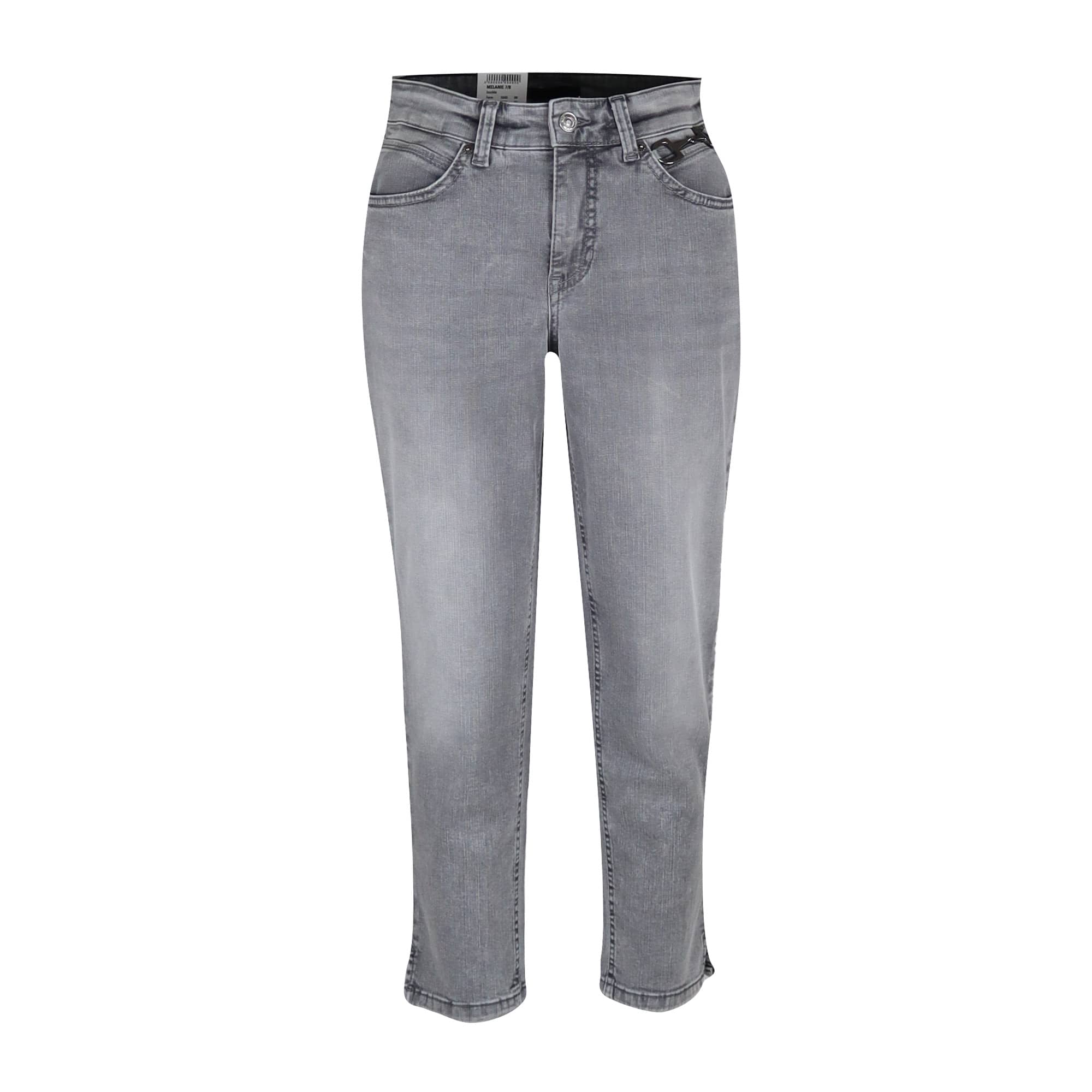 Grijze jeans van MAC, model Melanie 7/8 buckle feminine fit slim leg. Deze slim fit broek is gemaakt van stretch denim, heeft twee steekzakken aan de voorzijde waarbij er een met een decoratieve buckle, twee achterzakken en kleine splitjes in de zoom. De 7/8 jeans sluit met een knoop- en ritssluiting en heeft een hoge smalle taille.