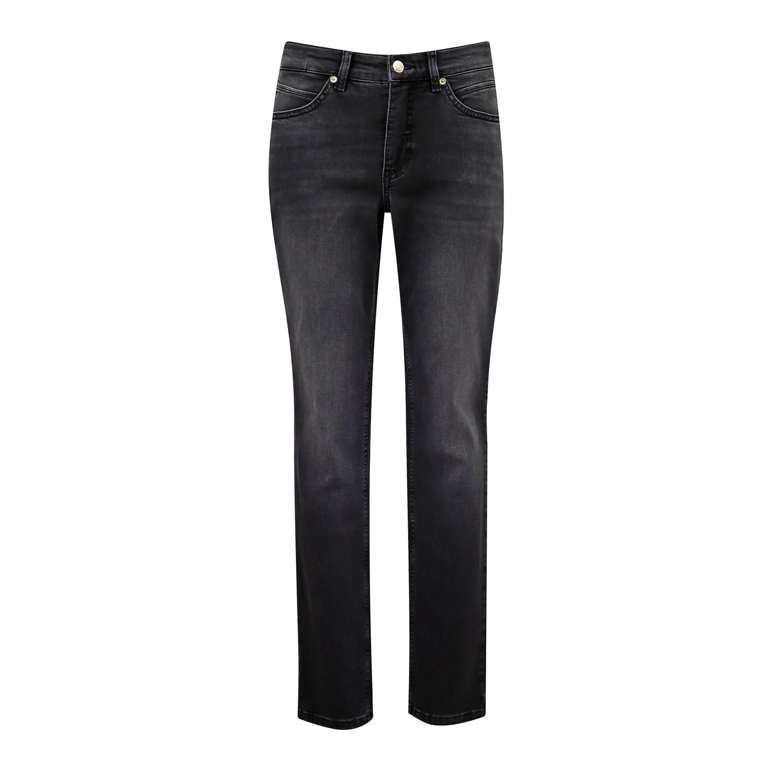 Grijze jeans van MAC, model Melanie wave glam, feminine fit, straight leg. Deze denim broek heeft rechte broekspijpen, twee steekzakken en twee achterzakken die versiert zijn met zwarte steentjes in de vorm van een golf. De jeans is gemaakt van stretch denim, sluit met een knoop- en ritssluiting en heeft een normale taille.