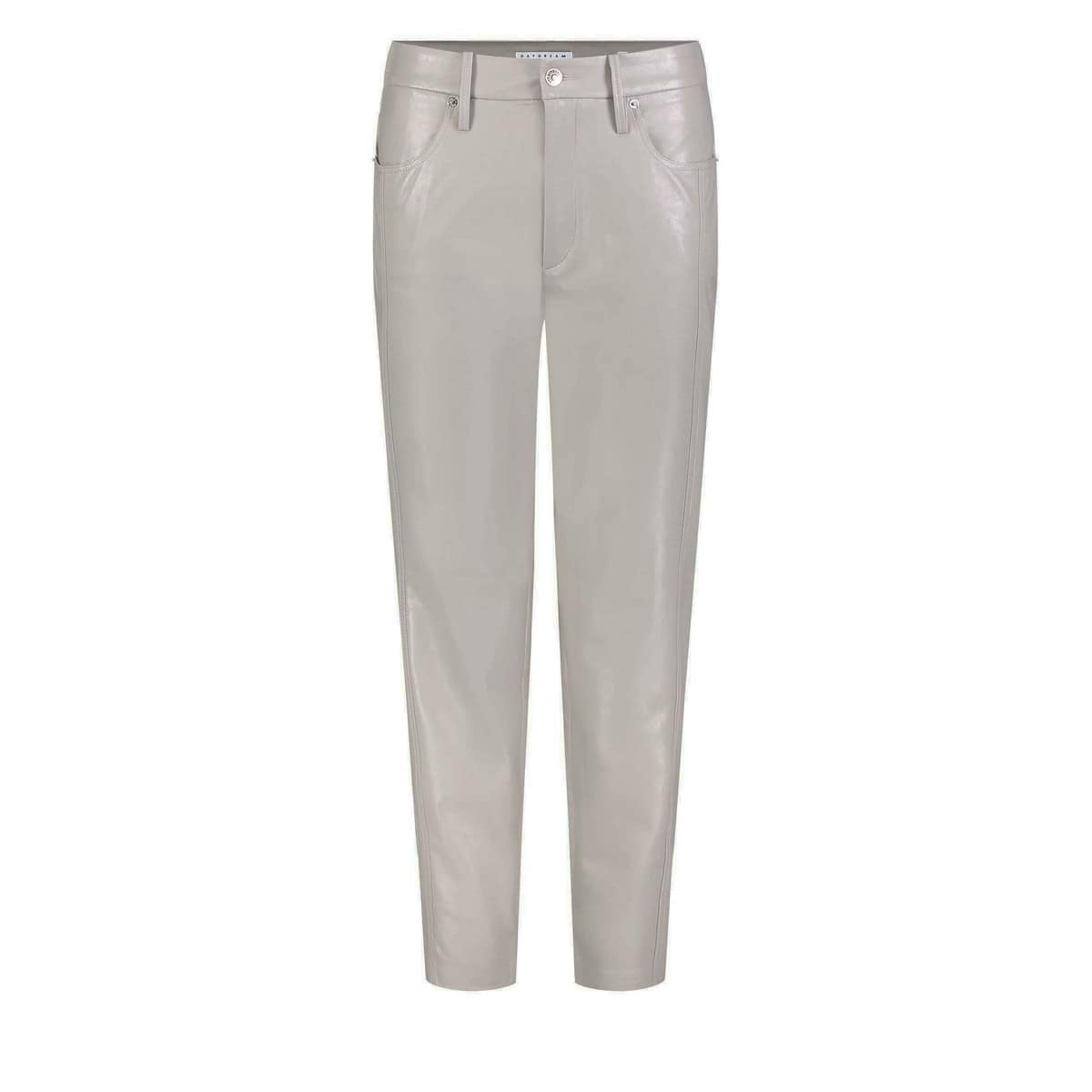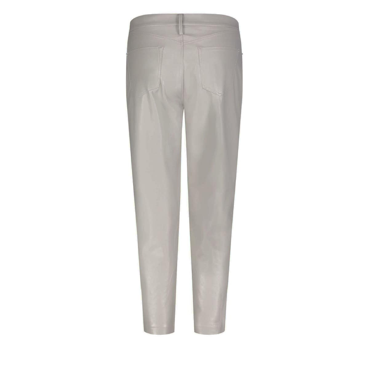 Grijze pantalon van MAC, model Beat Vegan. Deze slim fit broek is gemaakt van vegan nappa leer, heeft een relaxte fit met een hoge taille. De broek sluit met een knoop- en ritssluiting en heeft twee steekzakken en twee achterzakken.