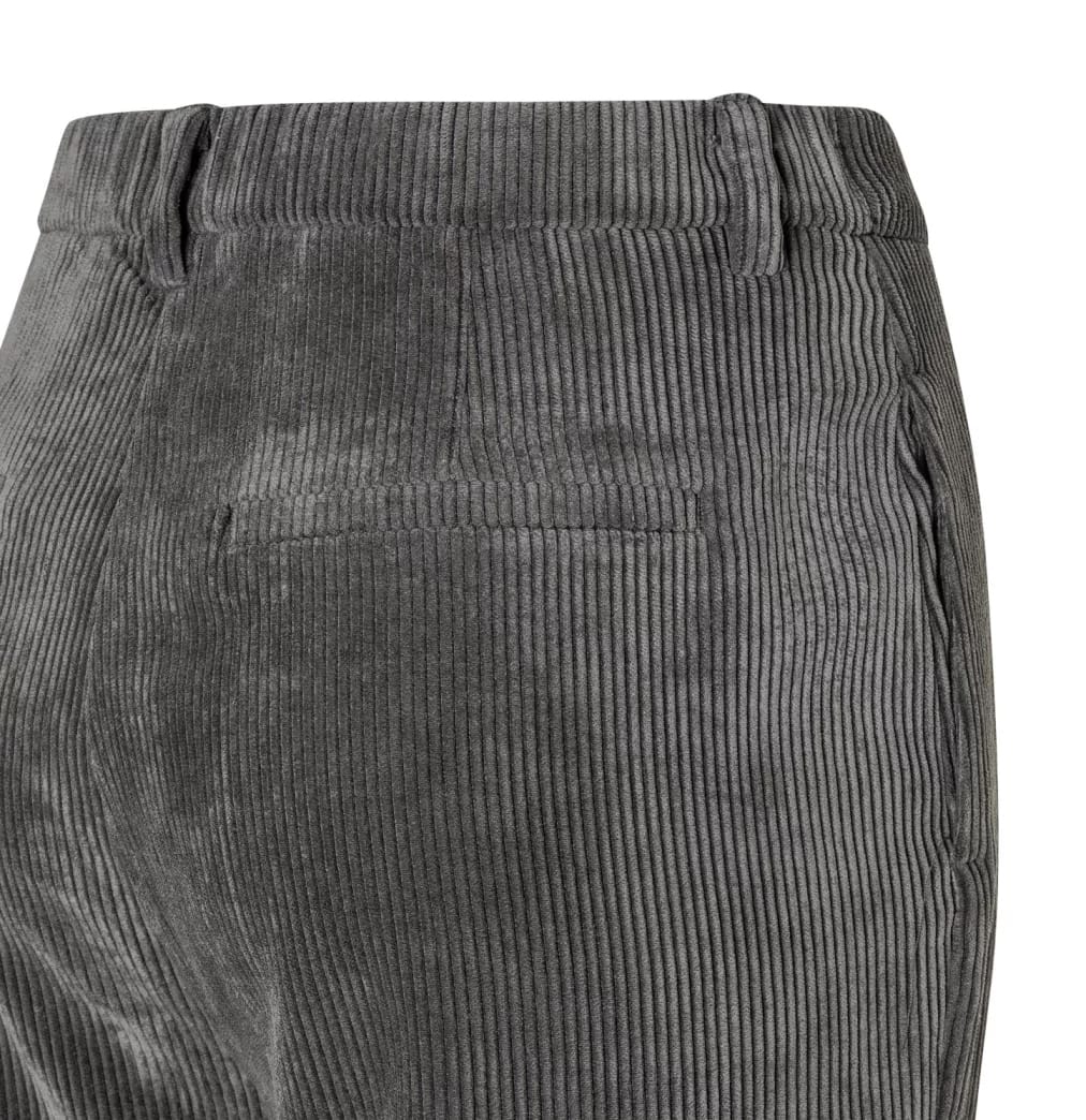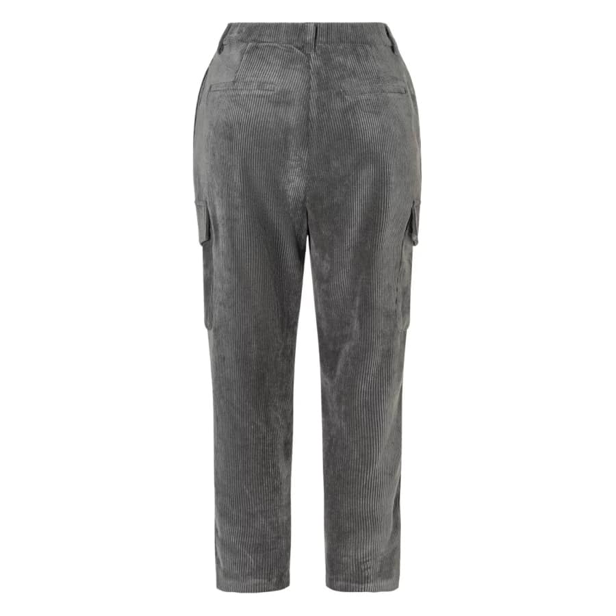 Grijze cargo pantalon van MAC, model Rahel comfy in earl grey. Deze broek is gemaakt van een ribfluwelen stof en heeft een relaxte slim fit pasvorm. De broek sluit met een knoop- en ritssluiting, heeft aam de achterzijde een elastische tailleband, twee steekzakken, twee sier paspelzakken en cargo zakken.