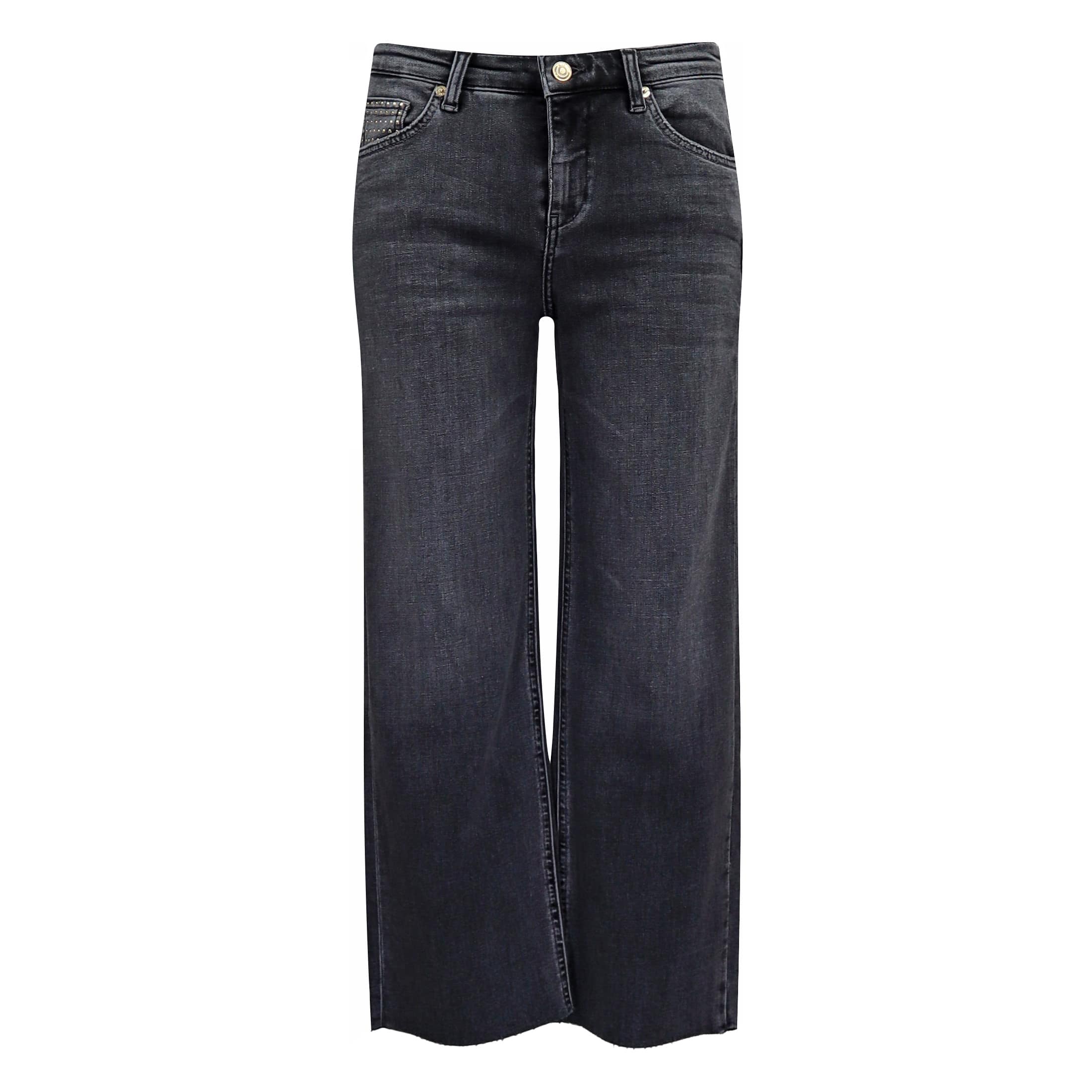 Grijze jeans van MAC x Sylvie Meis, model Rich Culotte gold. Deze culotte broek heeft een normale taille en een 7/8 lengte met wijde pijpen met een niet afgewerkte zoom. De jeans sluit met een knoop- en ritssluiting, heeft twee steekzakken waarvan er een versiert is met goudkleurige studs en twee achterzakken.