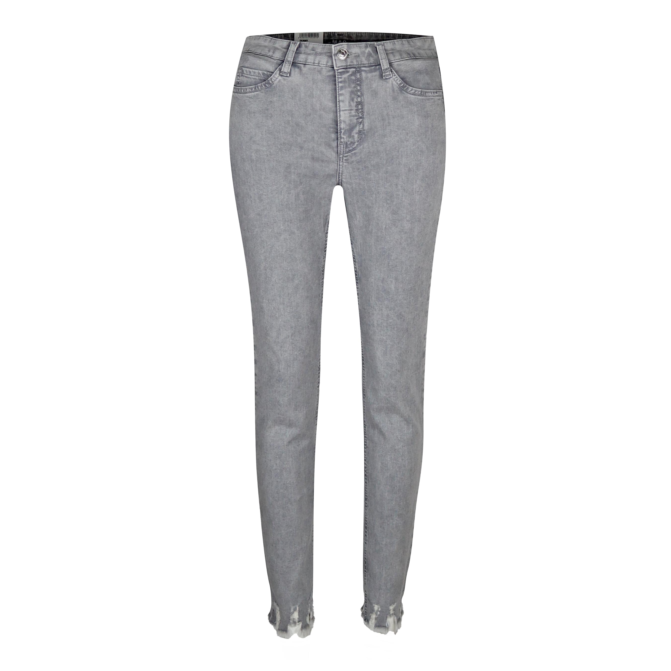 Skinny jeans van MAC, model Skinny straight fit skinny leg. Deze grijze denim broek heeft een smalle en hoge taille, twee steekzakken en twee achterzakken. De denim broek sluit met een knoop- en ritssluiting en heeft cropped broekspijpen met beschadigingen aan de zoom die boven de enkel vallen.