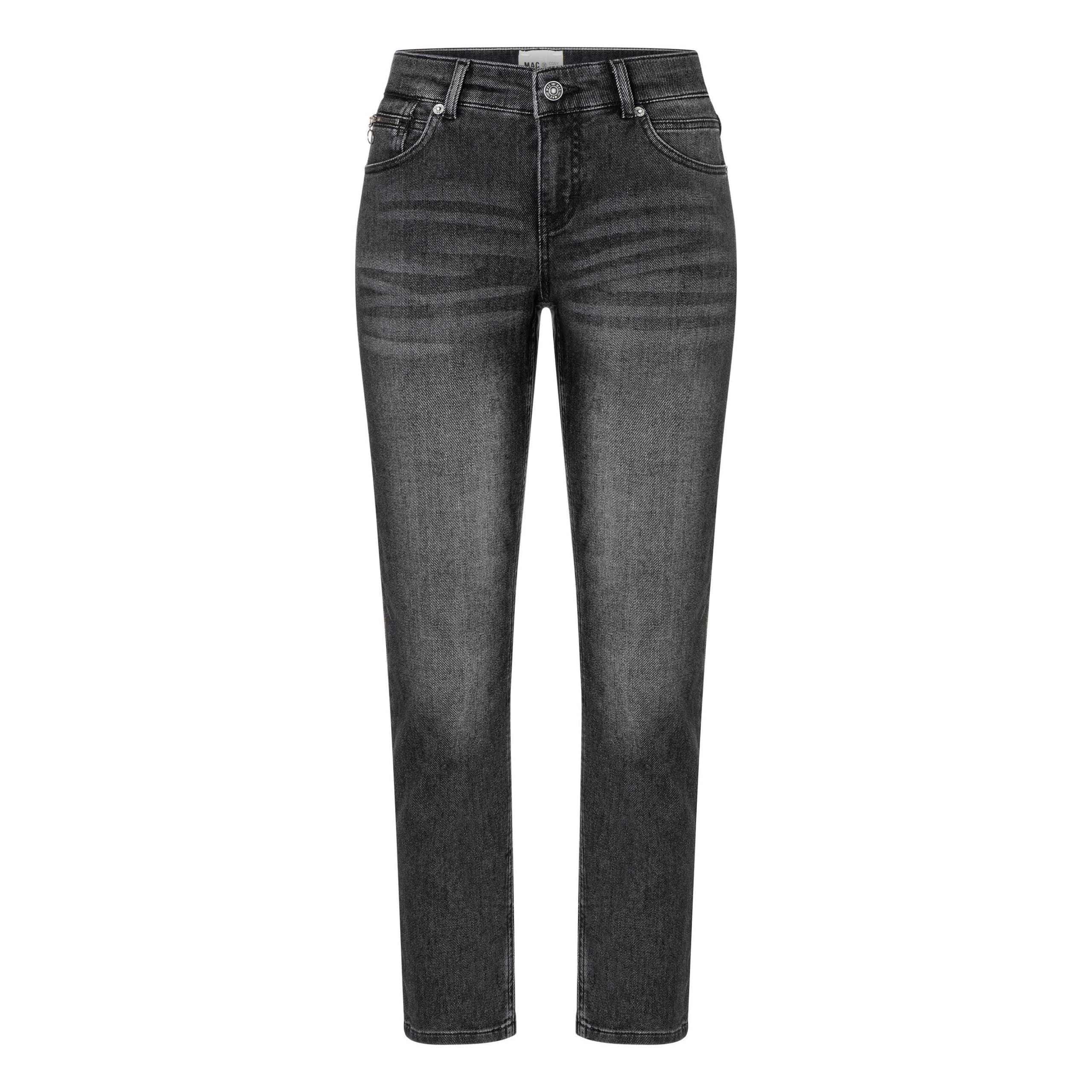 Grijze jeans van MAC, model Slim, straight fit, slim leg. Deze lange broek is gemaakt van stretch thermo denim en heeft een normale taille. De slim fit jeans sluit met een knoop- en ritssluiting en heeft twee steekzakken en twee achterzakken.