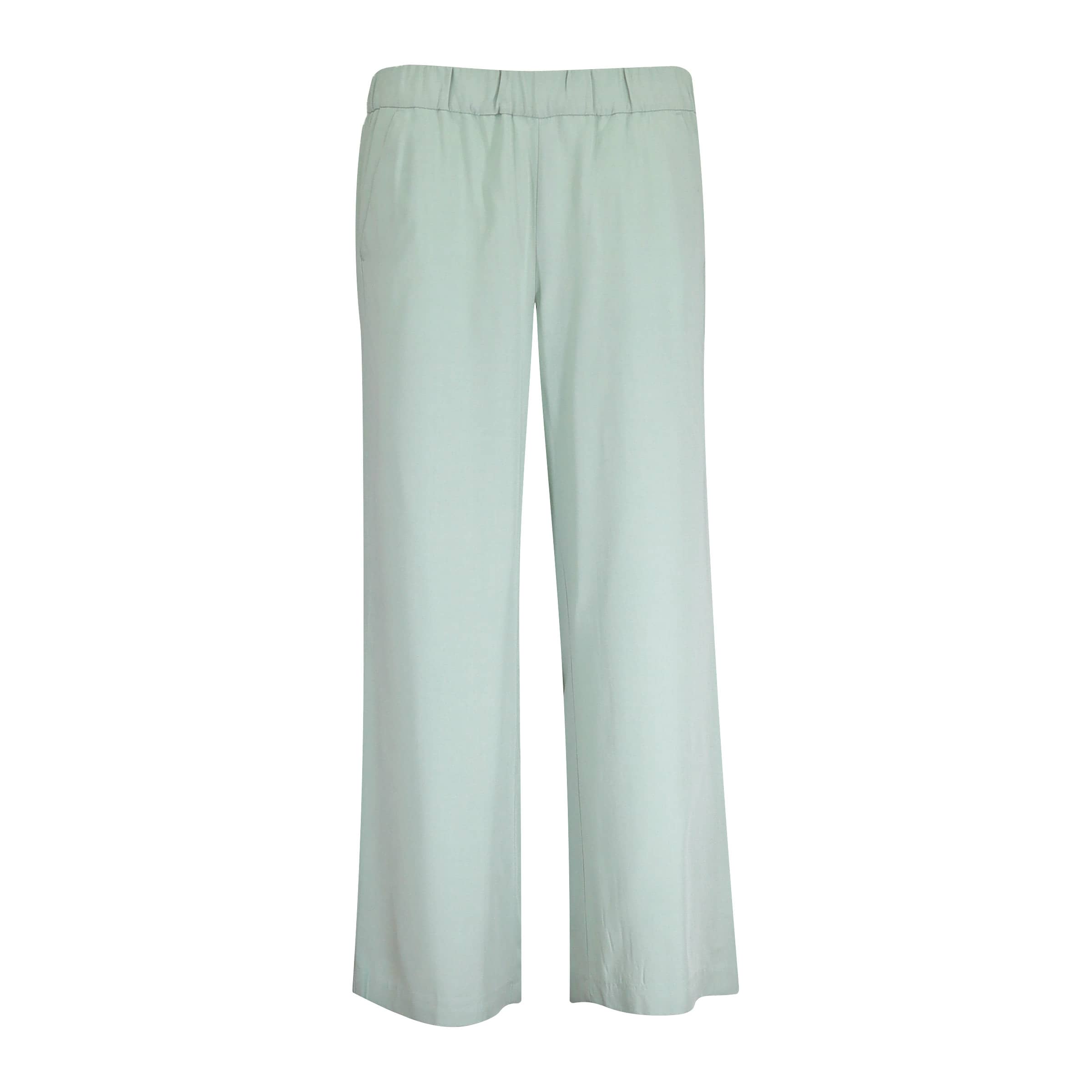 Pastel groene pantalon van MAC, model Chiara cropped. Deze relaxte pantalon is gemaakt van een dunne soepelvallende stof en heeft rechte wijde broekspijpen. De losvallende lange broek heeft een elastische taille en twee steekzakken.