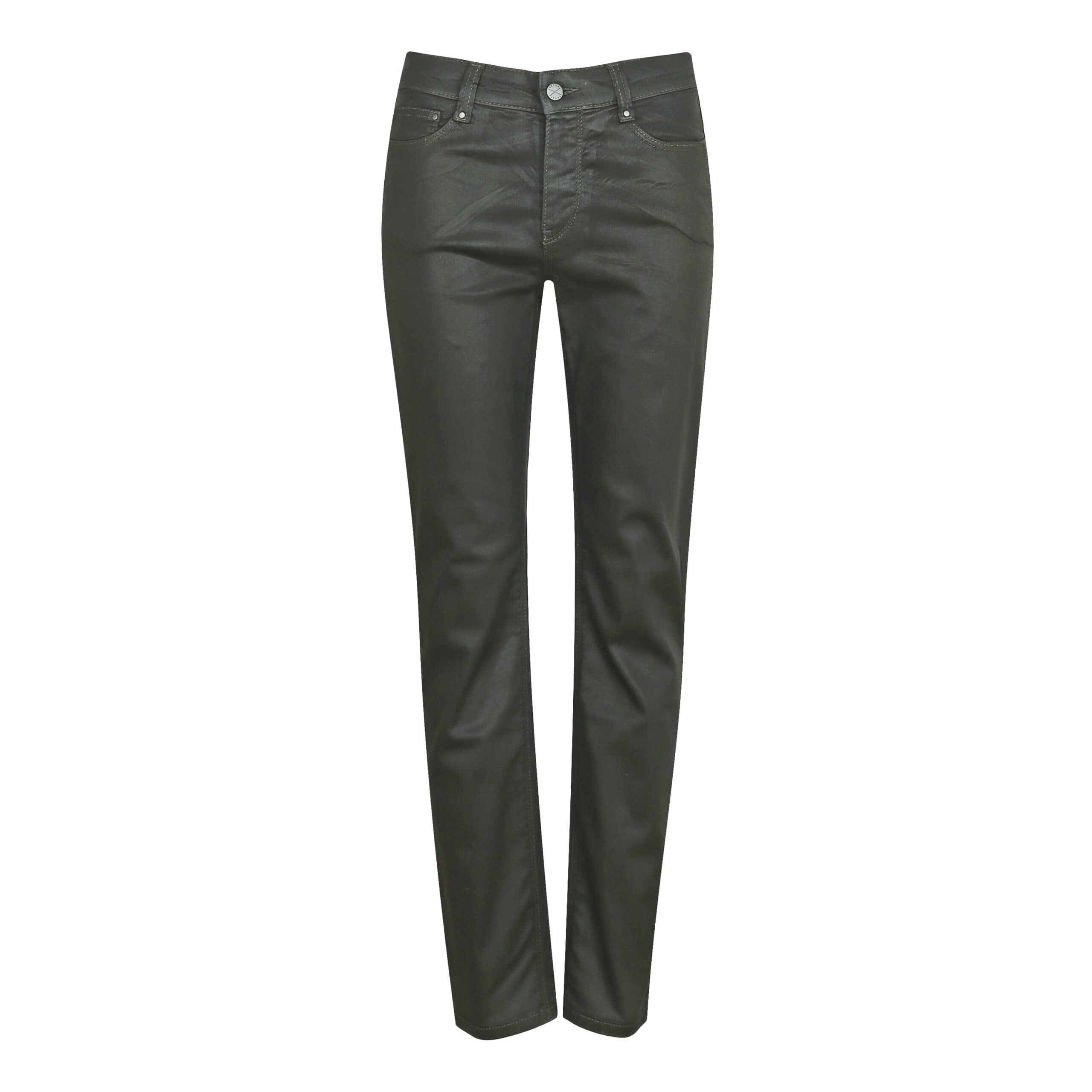 Coated jeans van MAC, model Dream, straight leg in leaf. Deze broek is gemaakt van een coated stretch stof, heeft een normale taille en rechte broekspijpen. De jeans sluit met een knoop- en ritssluiting, heeft twee steekzakken en twee achterzakken.